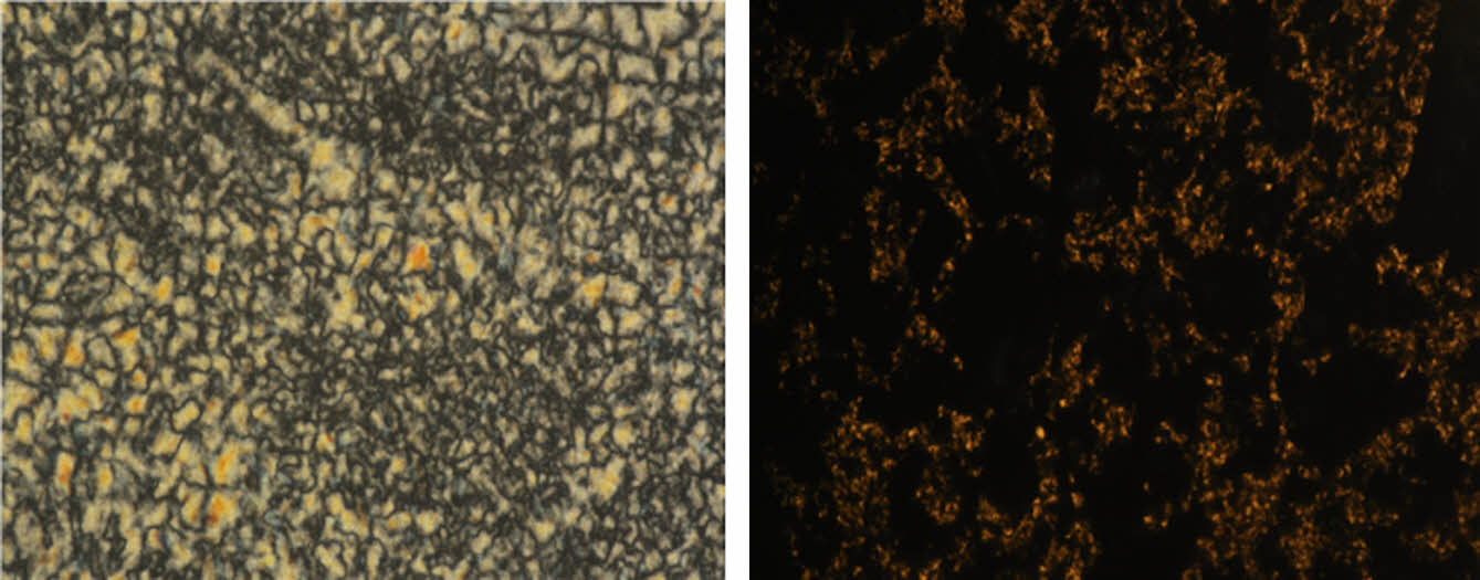 Figure 4 POM images nylon 6 (left) and nylon 6/EG10 composites (right) at 250 ℃ of 1℃/min. |