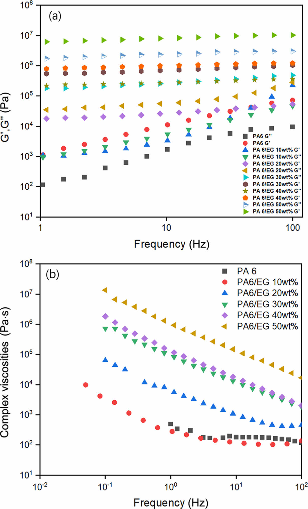 Figure 6 (a) Moduli; (b) complex viscosities of nylon 6/EG composites as a function of frequency. |