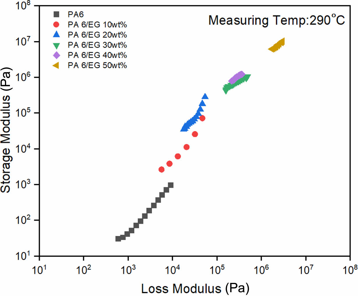 Figure 6에 나타나는 복소점도의 증가는 무기물의 첨가에 따른 탄성 특성의 증가에 의해 유추된 것으로 판단되어 탄성 특성에 대한 추가적인 분석을 위해 저장탄성률(storage modulus, G')과 손실탄성률(loss modulus, G'')을 도식화하여 Figure 7에 나타내었다. G''-G' plot에서 왼쪽으로 그래프가 이동하는 것은 탄성특성의 증가를 의미하는 것이며, EG의 함량이 증가할수록 탄성이 증가하는 것을 알 수 있다. 또한 G''-G' plot의 기울기는 고분자의 분자구조에 따라 변화하는 값으로 Table 2에서 나타내듯이 EG의 함량 변화에 따라 큰 차이를 보이지 않는 것을 확인할 수 있다.