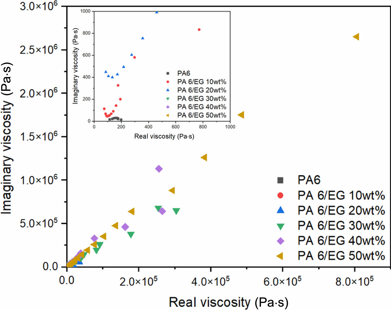 Figure 8 Real-imaginary viscosity plot for nylon 6/EG composites with different EG content. |