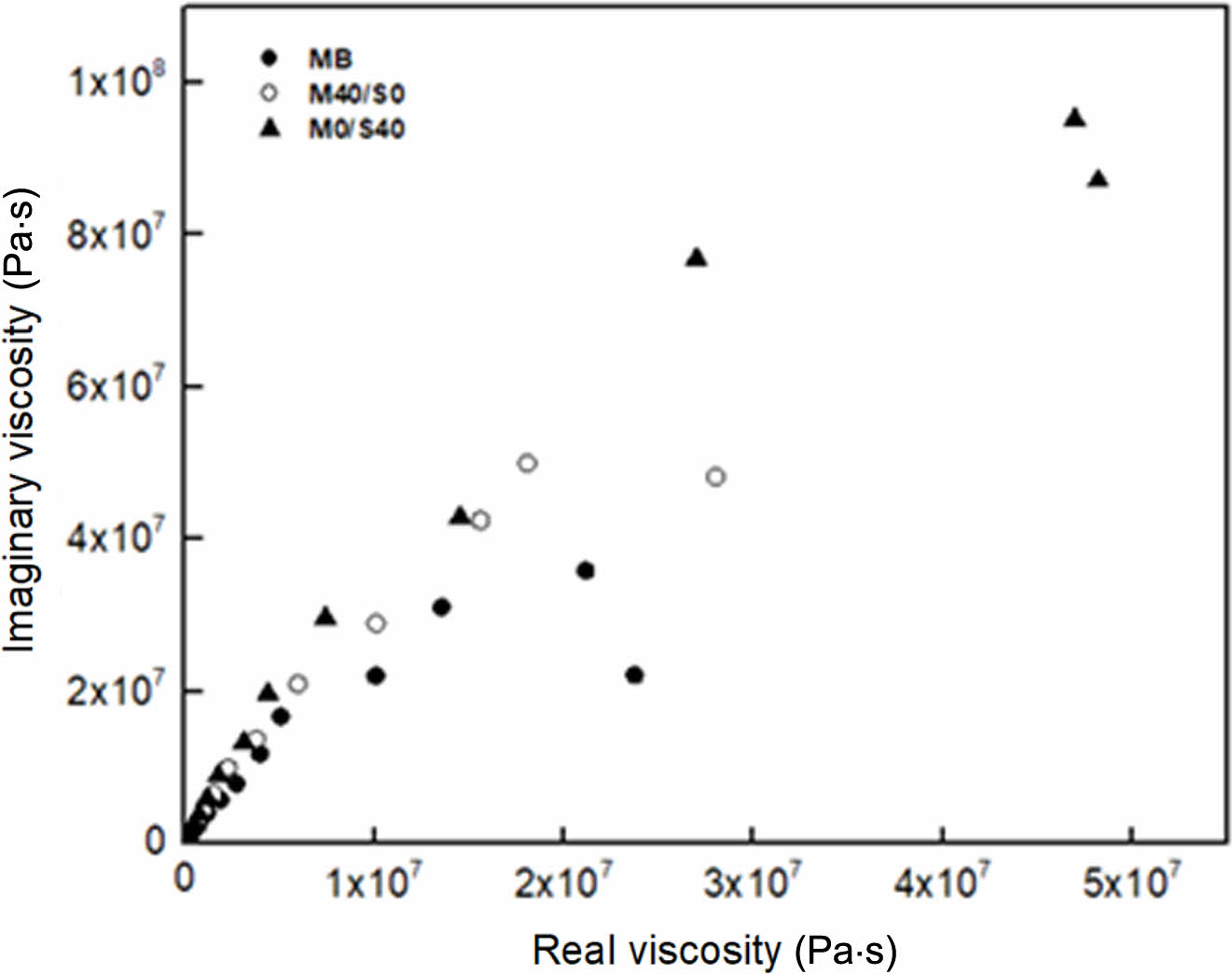 Figure 9 Real-imaginary viscosity plots for MB, M40/S0, and M0/ S40 composites. |