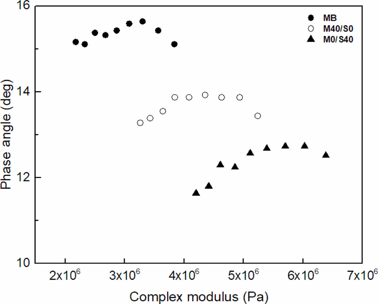 Figure 10 Van Gurp-Palmen plot for MB, M40/S0, and M0/S40 composites. |