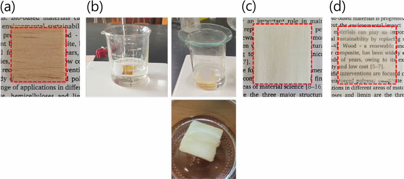 Figure 1 Digital photos of (a) a balsa wood; (b) the delignification process (including soaking, delignifying, and washing); (c) a dried delignified wood; (d) a polymer-infiltrated transparent wood. |
