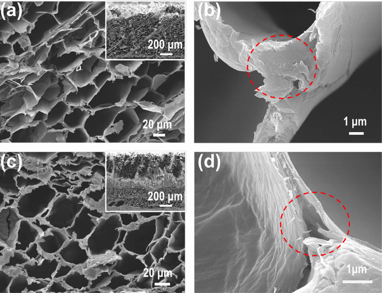 Figure 2 Low- and high-magnification SEM images of balsa wood cross-sections with lignin-filled and delignified cellulose interconnections (indicated by red dashed circles in b, d): (a, b) before; (c, d) after a delignification process. |