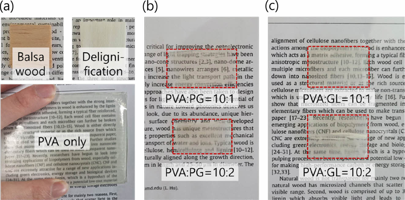 Figure 3 Digital photos of the transparent wood samples obtained by infiltrating various polymer solutions: (a) A bare and a delignified woods and a PVA-wood composite; (b) PVA/PG-wood composites; (c) PVA/GL-wood composites. |