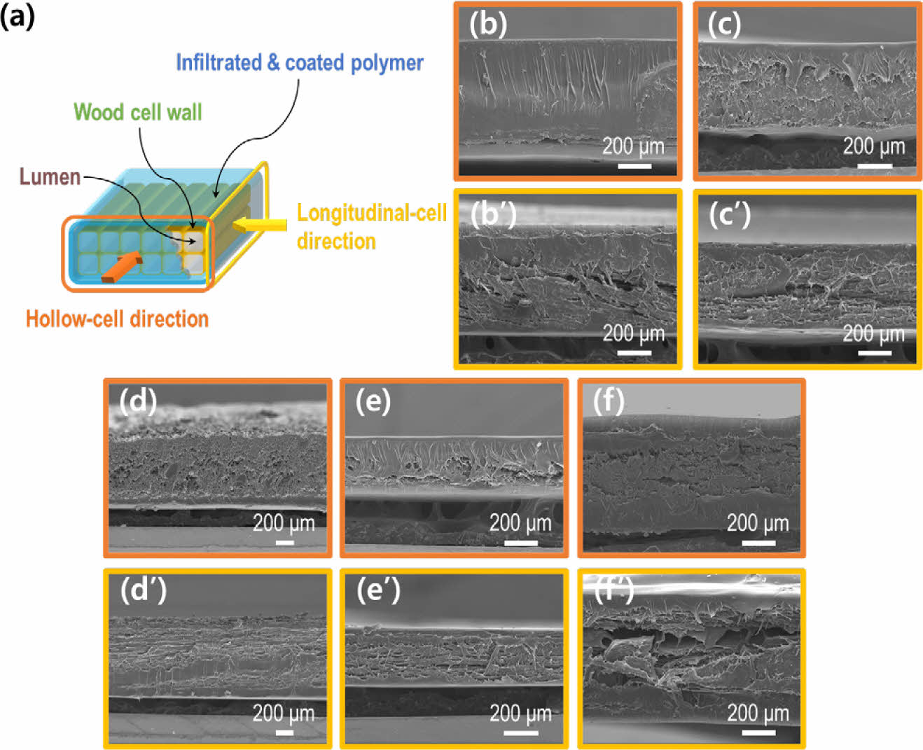 Figure 4 (a) Schematic illustration of transparent wood structure with the arrows indicating SEM-measuring directions; (b – f') SEM images of wood cross-sections infiltrated with (b, b') PVA; (c, c') PVA/PG1; (d, d') PVA/PG2; (e, e') PVA/GL1; (f, f') PVA/GL2. The orange and yellow lines indicate the positions of the samples observed using a SEM equipment. |