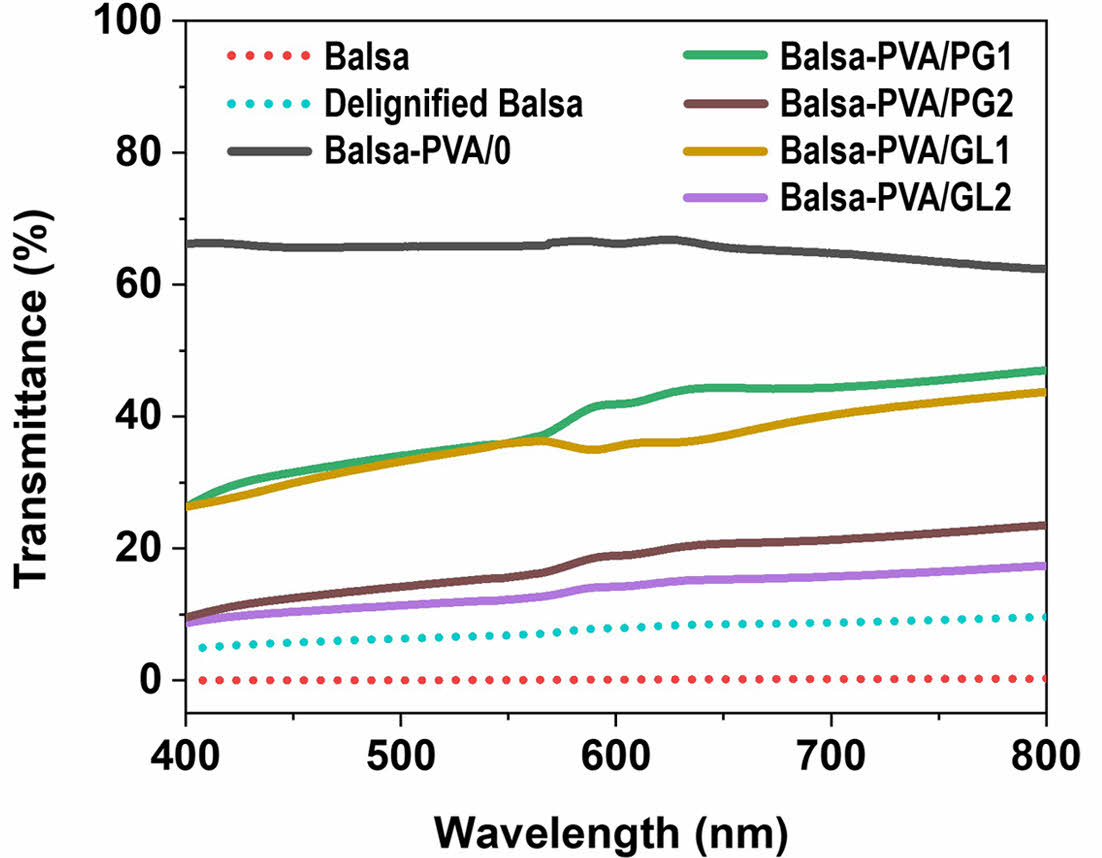 Figure 5에 나타낸 바와 같이 lignin이 제거되지 않은 샘플은 550 nm 파장에서 0.06%로 대부분의 파장대의 빛들은 투과되지 못하였으며, lignin이 제거된 샘플의 경우에는 6.84%로 매우 약한 광투과율을 나타냈다. 고분자 물질을 함침시킨 샘플들에 대하여 비교분석한 결과, PVA 물질만 함유된 transparent wood가 다른 샘플에 비해서 550 nm 파장 부근에서 65.8%의 높은 투과율을 나타냈다. 또한 400-800 nm 범위 전체에 60% 이상의 광투과율을 보였지만, 저분자 화합물이 포함된 PVA-wood composite 샘플들은 PVA 단독 샘플에 비해서 낮은 광투과율을 보였다. 저분자 화합물이 약 10% 함유된 PVA/PG1와 PVA/GL1의 광투과율은 550 nm 파장에서 각각 35.9%와 36.0%이나, 장파장에서는 PVA/GL1에 비해 PVA/PG1이 더 나은 광투과율을 보였다. 저분자 화합물의 함유량을 증가한 샘플은 광투과율이 더 낮아짐을 확인하였고, PG가 포함된 샘플이 GL 샘플보다 더 나은 광투과율을 나타냈다. PVA/PG2의 광투과율은 15.6%이며, PVA/GL2는 12.2%로 측정되었다. Figure 4에 나타낸 SEM 분석결과에서도 저분자 화합물 양이 증가할수록 기공이 발달되어 PVA 물질이 미충진된 곳이 관찰되었으며, 이 결과가 광투과율을 떨어뜨리는 요인으로 판단된다.