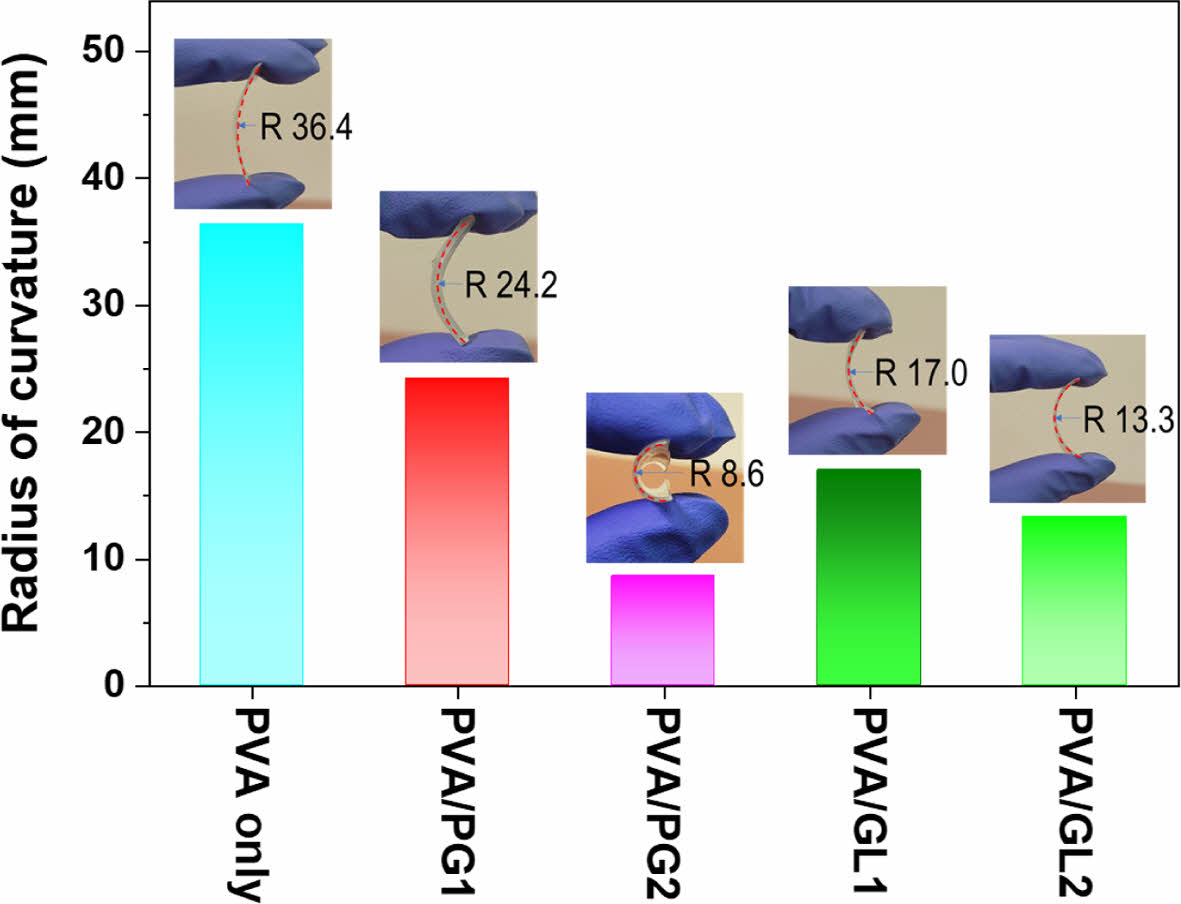 투명나무 샘플들의 유연성 비교. Figure 6은 transparent wood composites의 유연성을 비교한 그래프를 나타낸다. PVA 고분자는 유리전이온도(Tg)가 150 ℃로 매우 딱딱한 고분자 물질이다. PVA 단독으로 함침된 샘플은 36.4 mm의 매우 큰 곡률반경을 가지며, 단단하였다. 이에 반해, 저분자 화합물이 첨가된 PVA 혼합물이 함유된 샘플은 곡률반경이 줄어듦을 확인할 수 있었다. 특히, PG 함량의 높아질수록 매우 유연한 특성을 가짐을 관찰하였다.