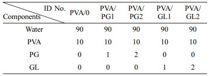 고분자 용액 함침 공정. 초순수 증류수에 무게 대비 PVA 분말 10 wt%를 80 ℃ 온도에서 교반하면서 녹였다. PVA 분말이 다 녹았는지를 육안으로 확인한 다음에 상온까지 PVA 용액을 서냉시켰다. 투명나무에 유연 특성을 부여하기 위하여 PVA와 저분자 화합물인 propylene glycol과 glycerol을 첨가하여 여로 종류의 PVA 혼합용액을 제조하였다. PVA 10 wt% 용액에 PVA 무게 대비 10%, 20%의 비율로 저분자 화합물을 첨가하였다(Table 1 참조). Delignified wood 시료들은 Petri dish에 넣고 시료두께 대비 약 4배의 높이로 10 wt% PVA 용액(PVA/0)을 부었다. PVA 용액이 시료내부 기공으로 침윤되도록 650 torr 진공압을 약 1시간 정도 유지한 후, 진공펌프를 끄고 약 1시간 동안 정치시켰다. 시료내부로 PVA 용액이 가능한 많이 침윤되게 하려고 위 공정을 3번 반복하였다. Table 1과 같이 다른 조성의 PVA 혼합용액(PVA/PG1, PVA/PG2, PVA/GL1, PVA/GL2)에 대한 침윤공정은 상기 실험방법과 같은 방법으로 진행되었다.