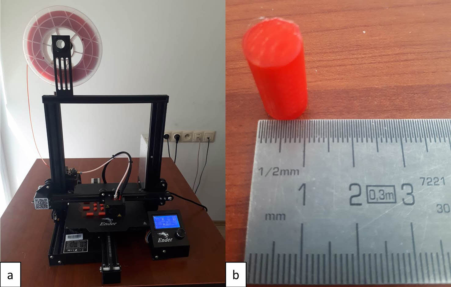 Material and Method. In this experimental study, PLA and PETG filaments supplied from MicroZEY company and material properties of the filaments were shared in Table 1 below. The wear test specimens with diameter of 10 mm and height of 20 mm were designed in Solidworks program and then modelled parts were transferred into 4.3.1 Ultimaker Cura slicing program. In the slicing program, FDM parameters were assigned like tabulated in Table 2 and lastly the g-codes were obtained for the 3D printing process. Lastly, polymer samples were produced with Ender Pro 3 model 3D printer like shown in Figure 1.