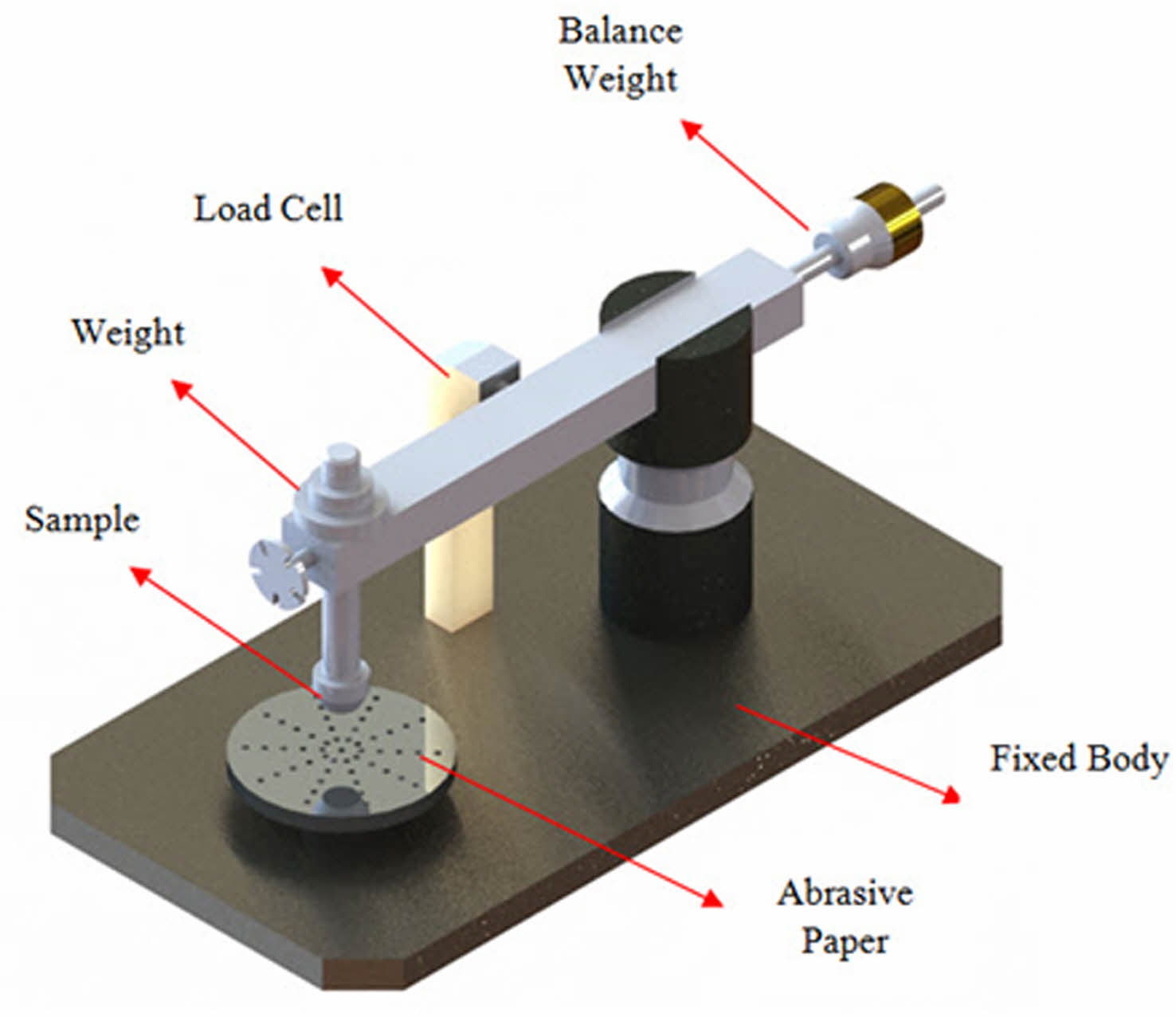 In the abrasive wear test, 5, 10, and 15 N loads were applied to all group samples, and the sliding speeds were determined as 0.5, 1, and 3 m/s, and the sliding distances were determined as 100, 200, and 300 m. 220 mesh abrasive sandpaper was used as abrasive. Abrasive wear tests were performed in a pin-on-disc device (Figure 2), and densities were measured in a RADWAG electrical device. An equal data logger was used in the measurement of wear forces. The experimental setup used in the abrasion tests is given in Figure 2.