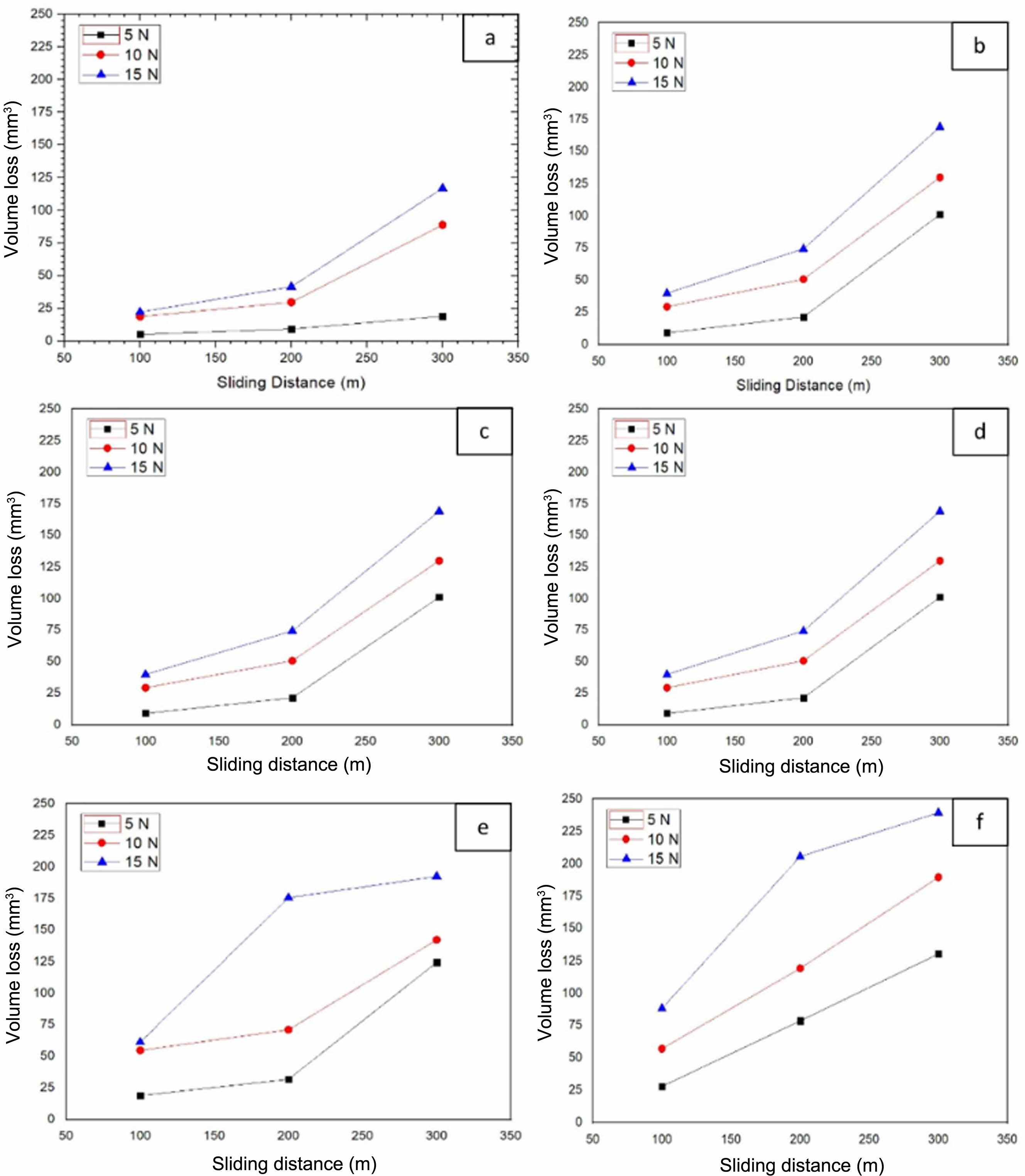 Variation of volume loss with sliding distance as a function of load: (a) PETG-0.5; (b) PETG-1; (c) PETG-3; (d) PLA-0.5; (e) PLA1; (f) PLA-3.