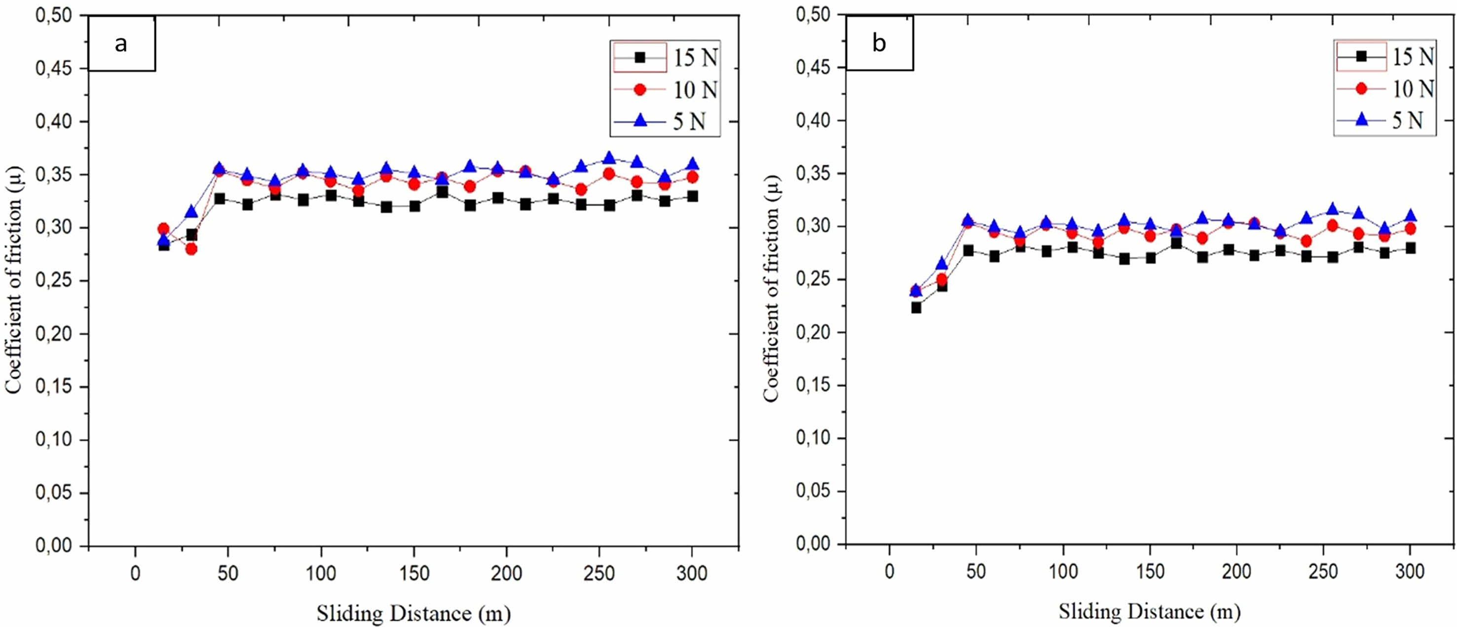 Effect of Wear Conditions on the Friction Coefficient of PETG and PLA Materials. The friction coefficient changes of the samples produced by the additive manufacturing method under different wear conditions, 5, 10, 15 N loading conditions, and 0-300 m sliding distance conditions are given in Figure 4. The friction coefficient changes in PLA samples were investigated (Figure 4). It was observed that PETG samples had a higher coefficient of friction than PLA samples.10-17 When examined in detail in Figure 4, it has been determined that the friction coefficient can be optimized by controlling the wear condition parameters. It was determined that the friction conditions increased significantly with increasing load. This increase in the friction coefficient can be explained by the increase in the wear interface with increasing load, resulting in a decrease in hardness and a significant increase in the amount of wear.11-20 It has been observed that friction forces fluctuate over different sliding distances. These differences in the friction coefficients can be explained by the regular friction forces and the layer changes in the samples produced by the additive manufacturing method.17-20