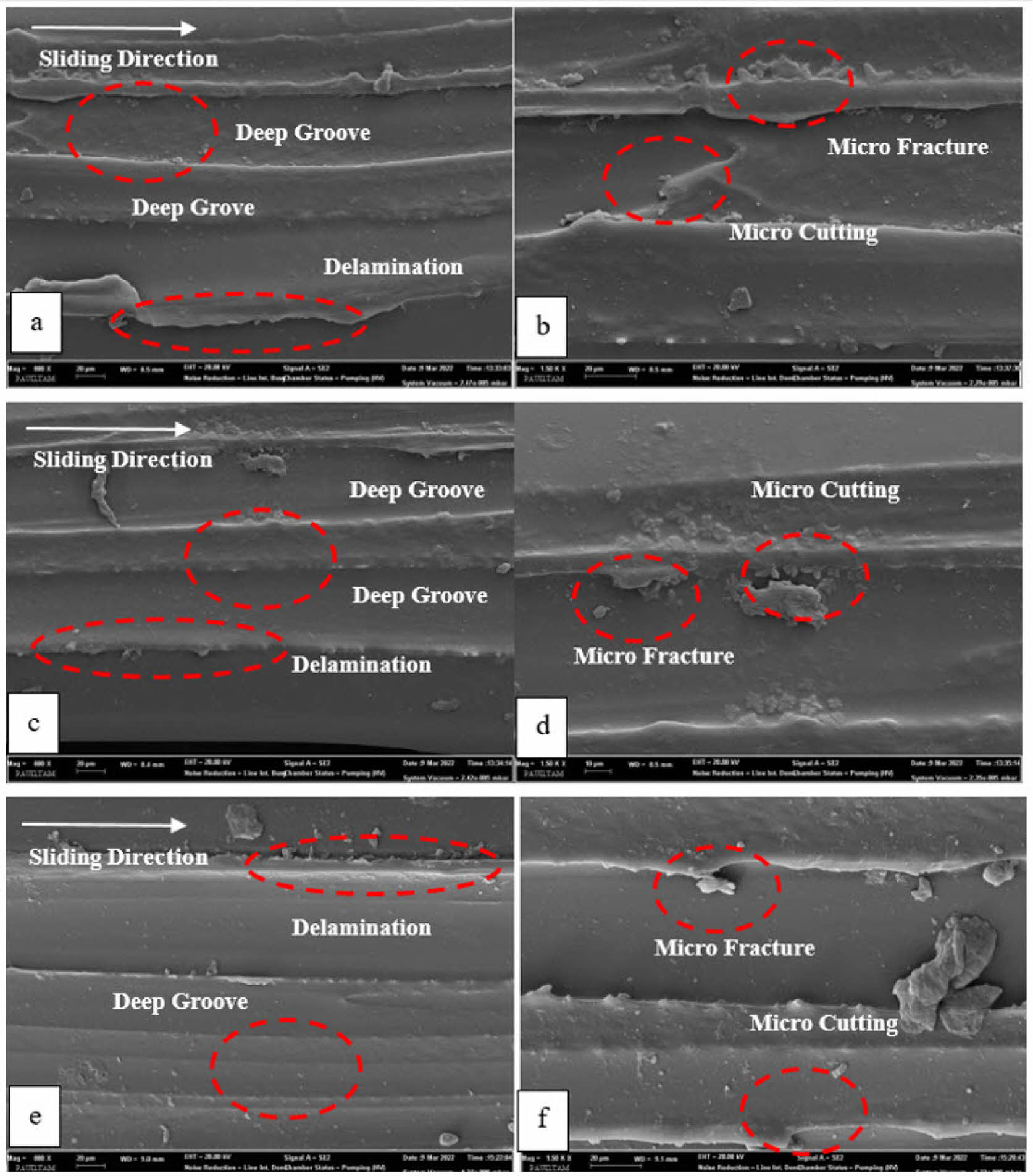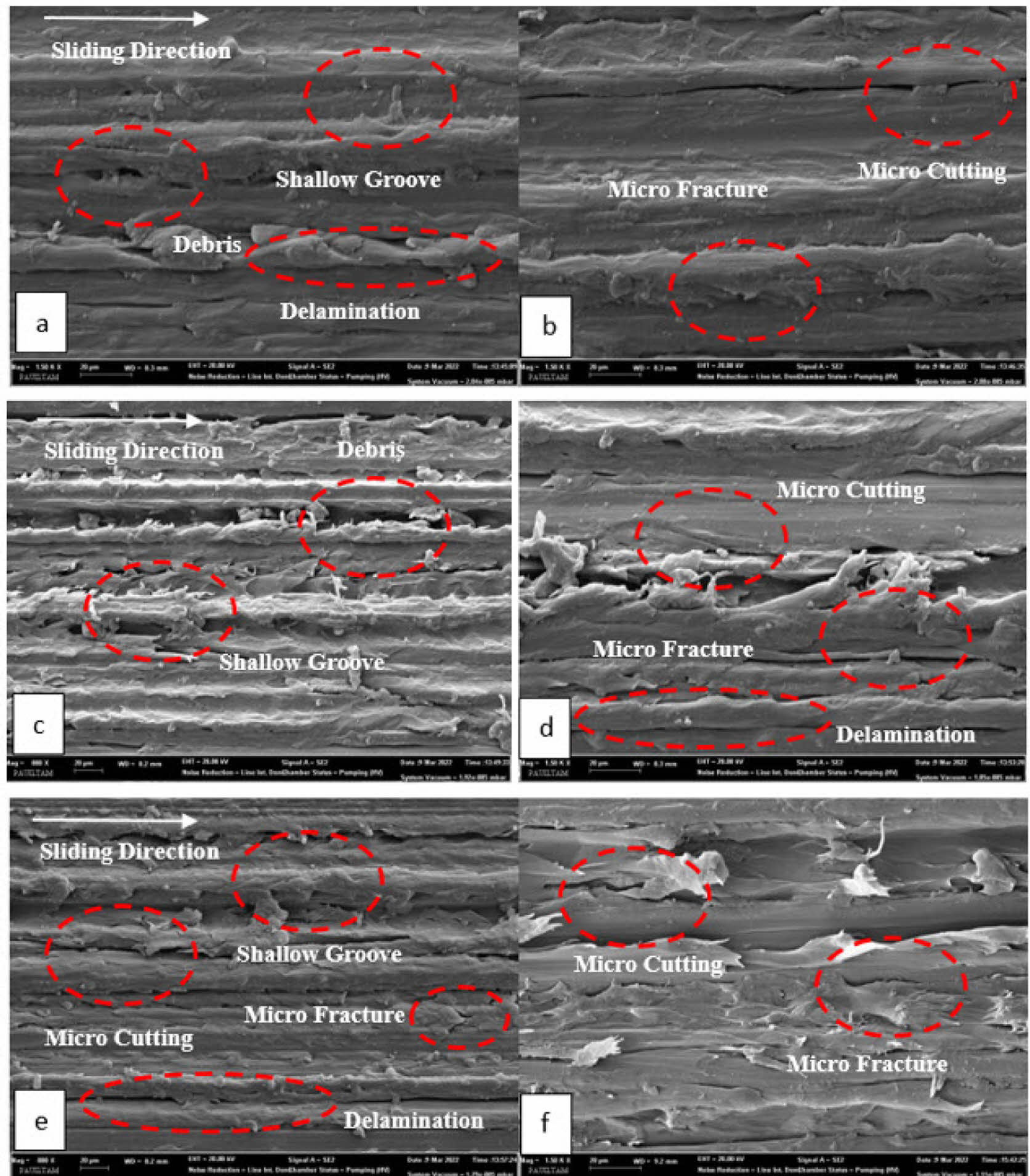 SEM Characterization of the worn surfaces of PETG samples: (a) general view of PETG-0.5 surface; (b) detailed view of micro fracture and cutting PETG-0.5; (c) general view of PETG-1; (d) detailed view of micro fracture, cutting and delamination in PETG-1; (e) general view of PETG-3; (f) detailed view of micro fracture and cutting in PETG-3. 600× and 1500× magnification respectively for (a), (c), (e) and (b), (d), (f).