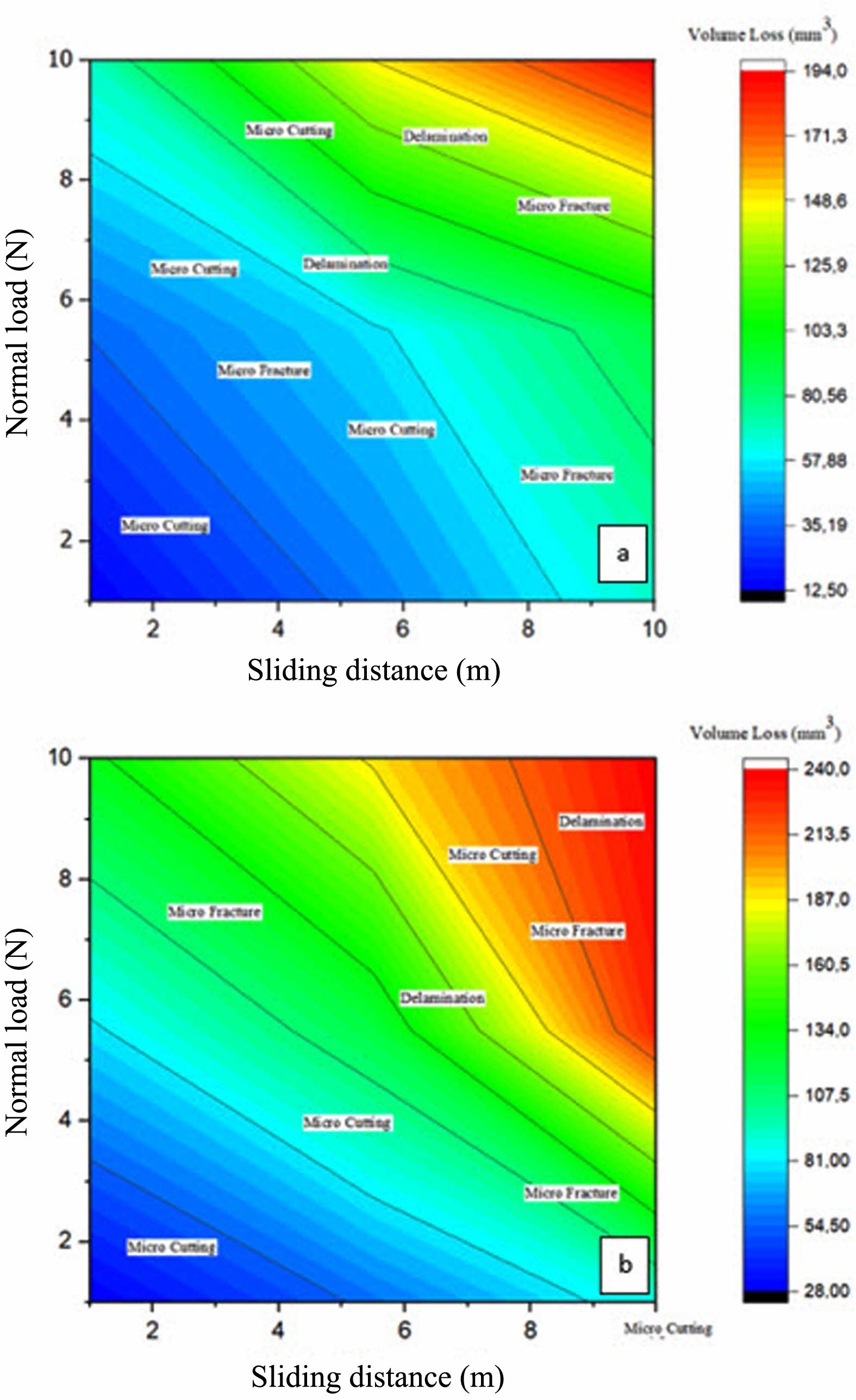 Detection of Wear Mechanisms by Worn Surface Characterization. SEM characterization of the worn surfaces of the worn samples was carried out to determine which wear mechanisms the PETG and PLA samples were exposed to under different wear conditions (Figure 5-6). It was determined that the depth and width of the wear cavities increased significantly with increasing loading conditions with wear cavities formed at low wear loads (Figure 5). In addition, it is observed that debris is formed on the surfaces corresponding to the layer widths of the samples with a layered structure. It has been observed that micro fractures are formed by increasing wear load. Fatigue and micro-cutting wear mechanisms were determined (Figure 5). Wear mechanisms play an essential role in determining and optimizing wear behavior. It is clearly understood in Figure 6 that the wear mechanisms directly determine the wear conditions. At low conditions, it is seen that the micro-cutting mechanism caused by abrasive particles dominates, while the increased sliding distance and delamination and fatigue wear mechanisms seem to be the more dominant mechanisms. Delamination and fatigue mechanisms cause volume loss to increase rapidly. This wear map obtained from the experimental results will form a vital data map for optimizing the wear resistance of the PETG sample under different wear conditions.