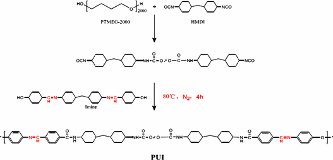 Synthesis of Self-healing Polyurethane. Using PTMEG-2000 and HMDI as raw materials, the prepolymer was synthesized by inert gas reaction at 80℃ for 4 h. BDO and Imine were added to the prepolymer in proportion for 4 h, and then cured and dried to obtain thermoplastic polyurethane elastomers, which were called PU0, PUI-1, PUI-2, PUI-3, and PUI-4, as shown in Table 1. The composite diagram is shown in Figure 1.