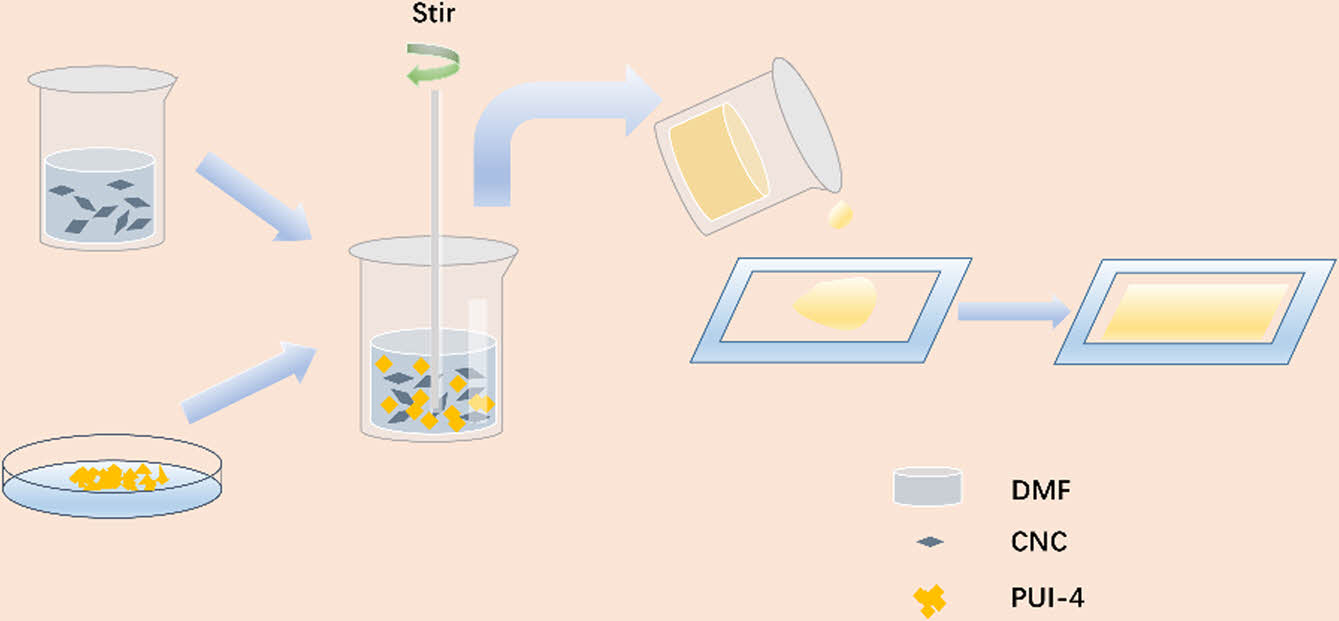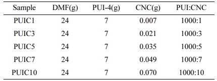 Preparation of PUI/CNC Composites. An appropriate amount of cellulose nanocrystals was placed in 24 g DMF for ultrasonic shock for 20 min, and 7 g of PUI-4 was cut into pieces, which were dissolved at 80℃ and dried into films. According to the different content of CNC, they were called PUIC-1, PUIC-3, PUIC-5, PUIC-7, and PUIC-10, as shown in Table 2. Figure 2 shows the process of preparation.
