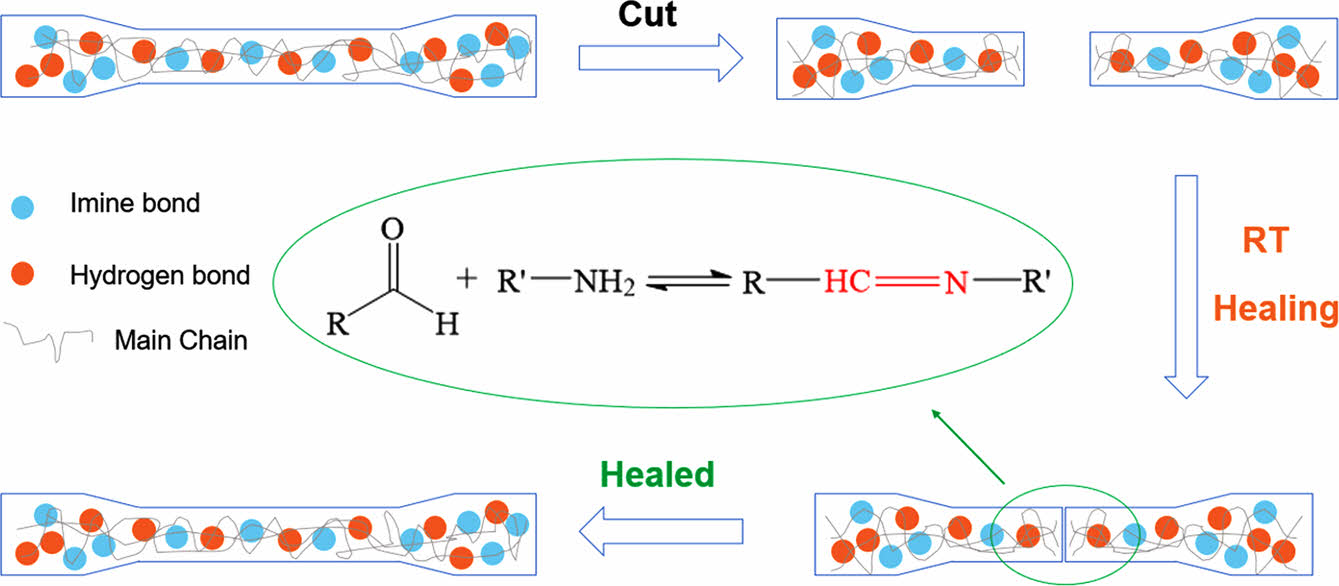 are the most common types of intrinsic self-healing materials. The imine bond is a highly efficient reversible covalent bond, which can be dynamically converted at room temperature or under the catalysis of water without any external stimulation. In 2017, Zhang et al.12