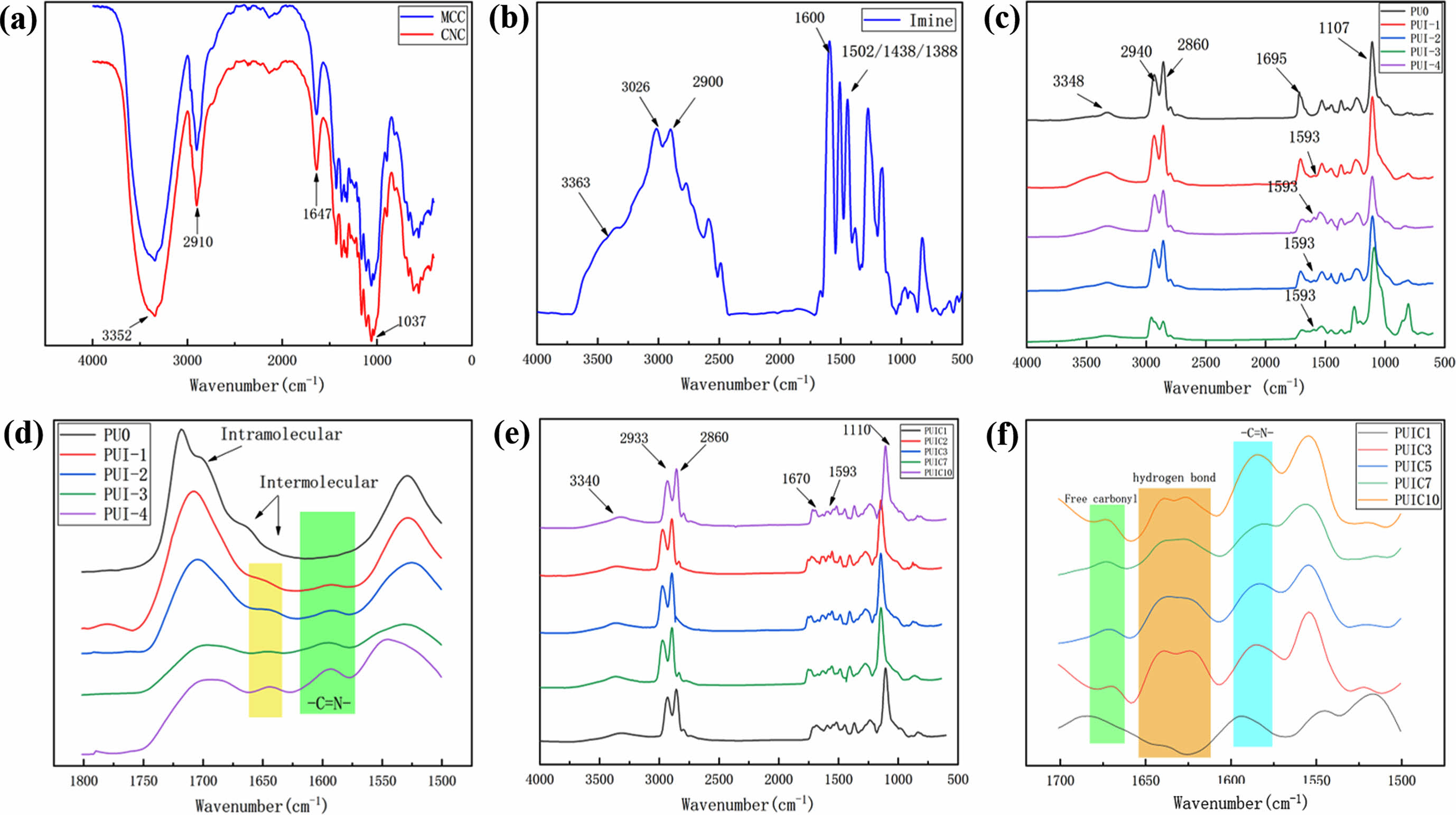 Figure 4 Infrared spectra of (a) CNC; (b) Imine; (c) PU0 and PUI-1~4; (d) Local magnified infrared spectra of PU0 and PUI-1~4; (e) PUIC 1~10; (f) Partial infrared magnification of PUIC1~10. |
