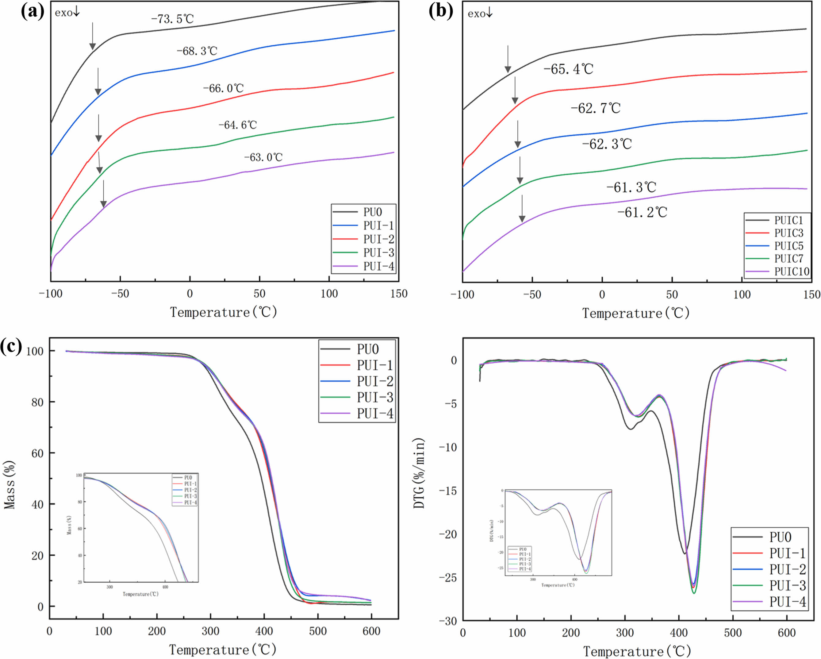 Figure 5 (a) DSC curves of PU0 and PUI-1~4; (b) DSC curve of PUIC1~10; (c) TGA and DTG curves of PU0 and PUI-1~4 |