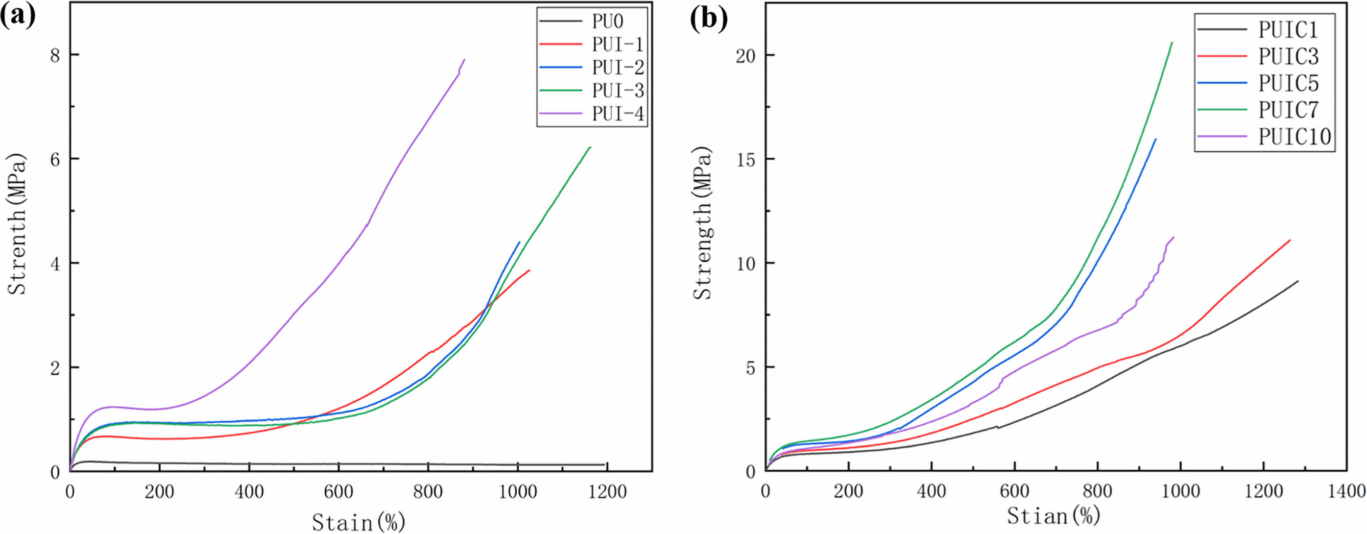 Figure 6 Mechanical property curves: (a) PU0 and PUI-1~4; (b) PUIC1~10. |