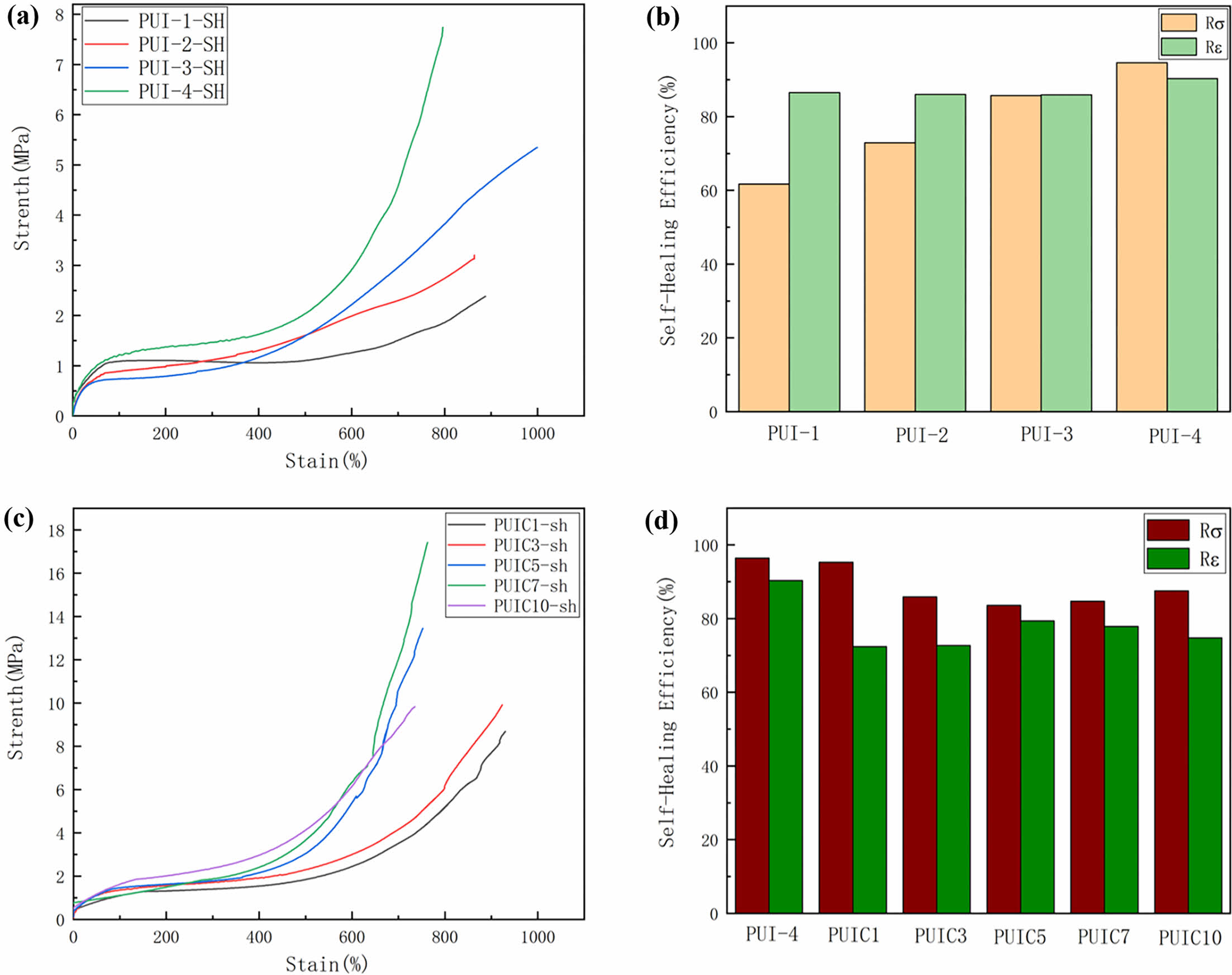 Figure 7 (a) Mechanical properties curves of PU0 and PUI-1~4 after self-healing; (b) variation trend of self-healing efficiency of self-healing polyurethane; (c) mechanical property curve of PUIC1~10 after self-healing; (d) variation trend of self-healing efficiency of PUI/CNC. |