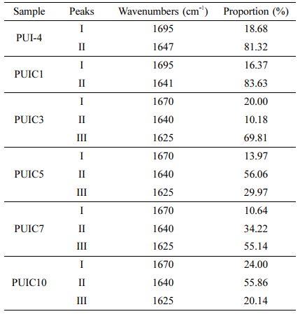 It can be seen from Table 7 that in addition to the increase in the percentage of free carbonyl in PUIC3, the trend of the whole group of samples showed a trend of first increasing and then decreasing. The addition of cellulose nanocrystals increased the hydrogen bonding of polyurethane, and the percentage of free carbonyl groups decreased from 18.68% of PUI-4 to 10.64% of PUIC7, and then increased to 24% of PUIC10.