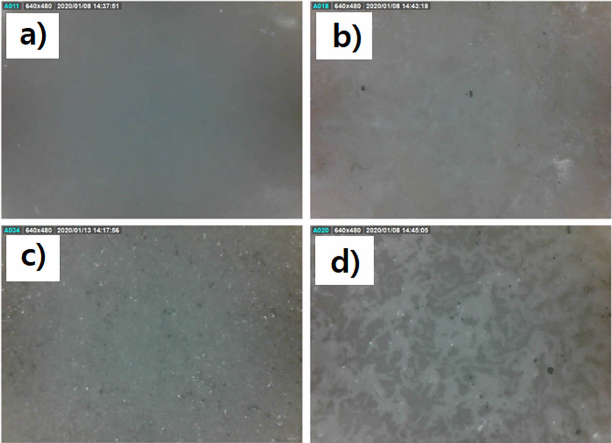 Figure 2 Surface morphological study and dispersion state of shellac composite according to calcium phosphate using a digital microscope calcium phosphate: (a) 0; (b) 0.1; (c) 0.2; (d) 0.5 mg/mL, ×250, scale bar: 400 µm. |