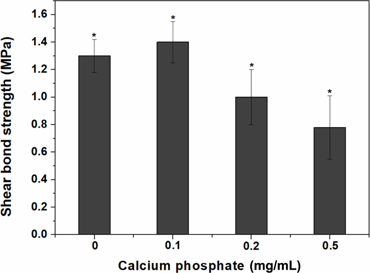 Figure 3 Shear bond strength of shellac composites according to calcium phosphate (n=5, * P < 0.05). |