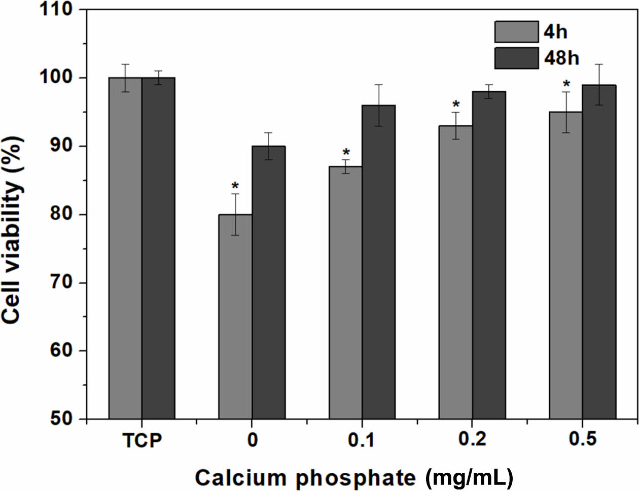Figure 4 Cell viability of shellac composites according to calcium phosphate (TCP: tissue culture plate, n=5, * P < 0.05). |