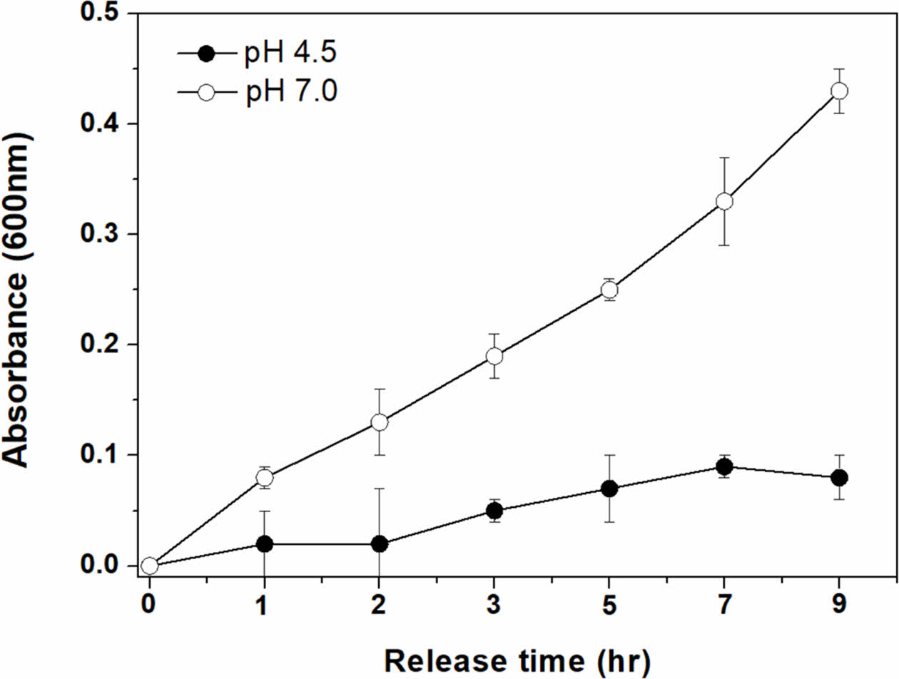 Dye Release Test from Shellac Composite Film. Drug release from the shellac composite film was simulated using the dye acid blue-25. In Table 1, acid blue-25 (0.5 mg/mL) was mixed with the composition of Sample No. 4 to prepare a film. Without going through a separate washing step, the film was incubated and recovered at 37 ℃ at 50 mL of pH 7.0 PBS and pH 4.5 sodium acetate buffer for 0, 1, 2, 3, 5, 7, and 9 hours, concentrated, and put into a 96-well plate. The amount of the released dye was determined by measuring the absorbance at 600 nm using a microplate reader.
