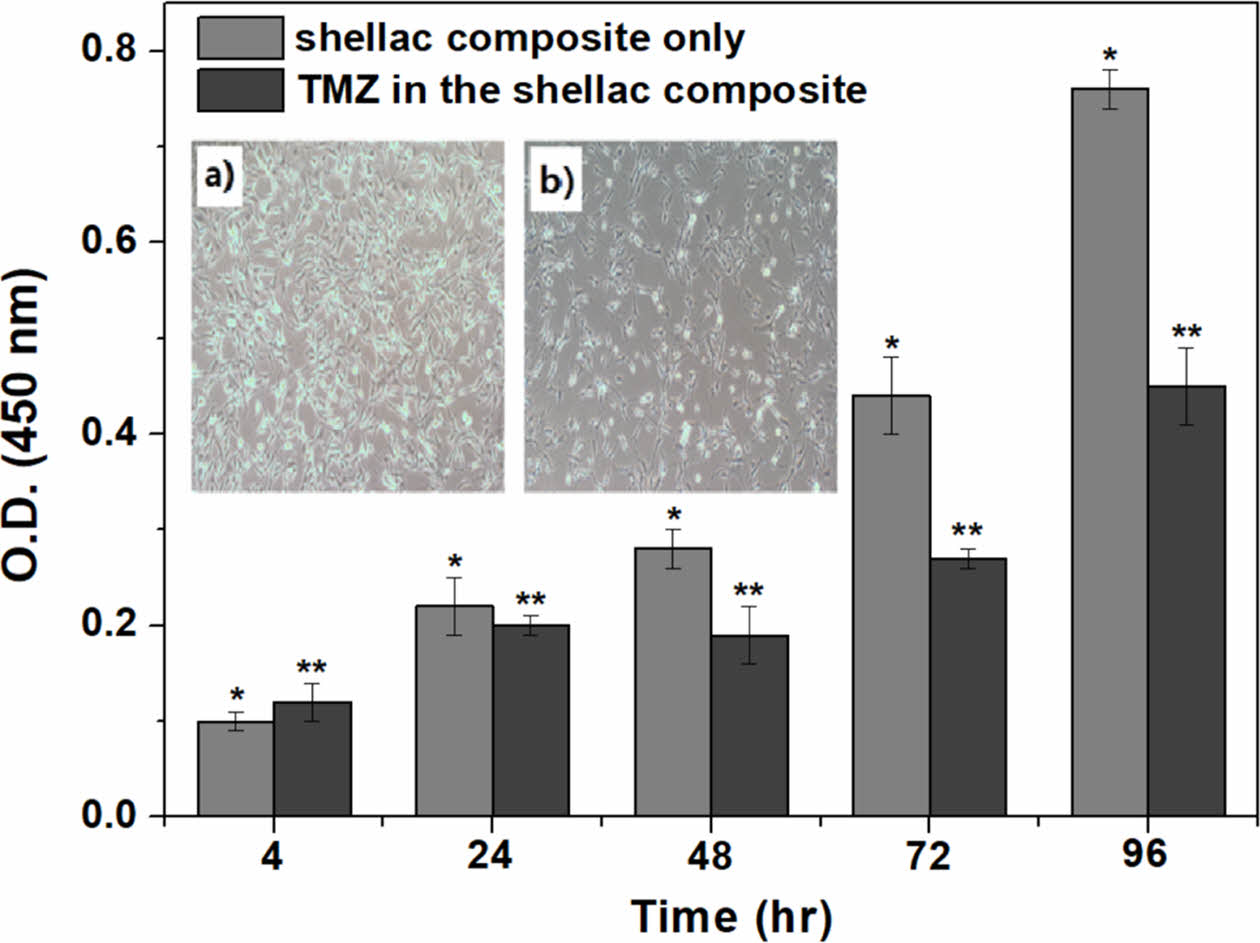 Temozolomide (TMZ) Release Test and Cytotoxicity. Drug release from the shellac composite was also simulated using TMZ. In Table 1, TMZ (1 mg/mL) was mixed with the composition of Sample 4 to prepare a film. Without going through a separate washing step, the film was incubated in the cell culture plate. The U-87GM cells were added directly to each plate in 200 µL of media (Dulbecco’s modified Eagle’s medium with 2 mM l-glutamine and 10% fetal bovine serum) suspension. The cell density was set at 2 × 104 cells per well. After 1 h, 1800 µL of the medium was added to each well and incubated at 37 ℃ and 5% CO2. The proliferation was quantified after 4, 24, 48, 72, and 96 hours using a WST-8 assay.