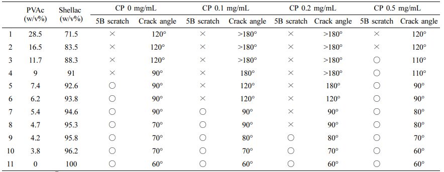 Table 1 Mechanical properties according to polyvinyl acetate (PVAc), shellac, and calcium phosphate (CP) contents |