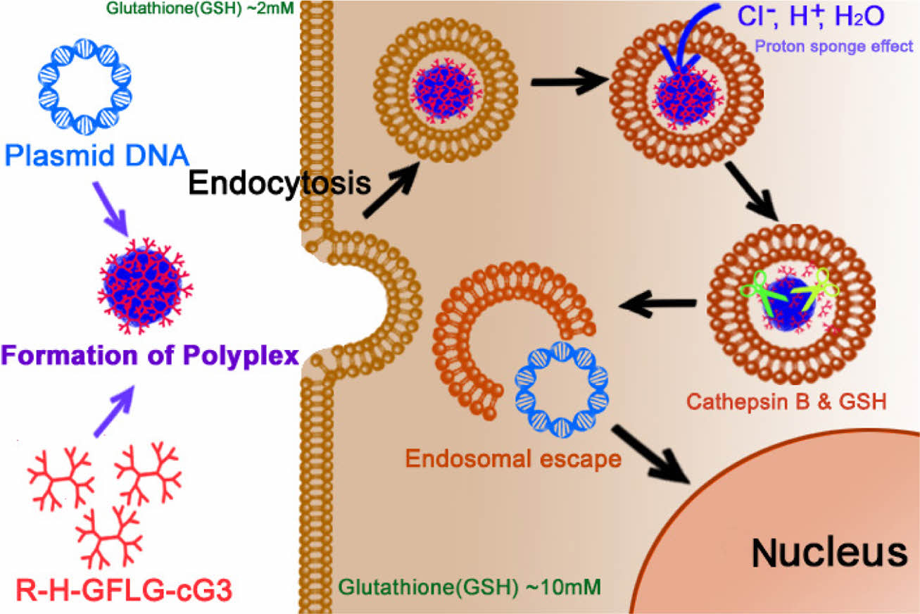 Figure 1 Illustration of the transfection of R-H-GFLG-cG3 PAMAM dendrimer/plasmid DNA polyplexes. |