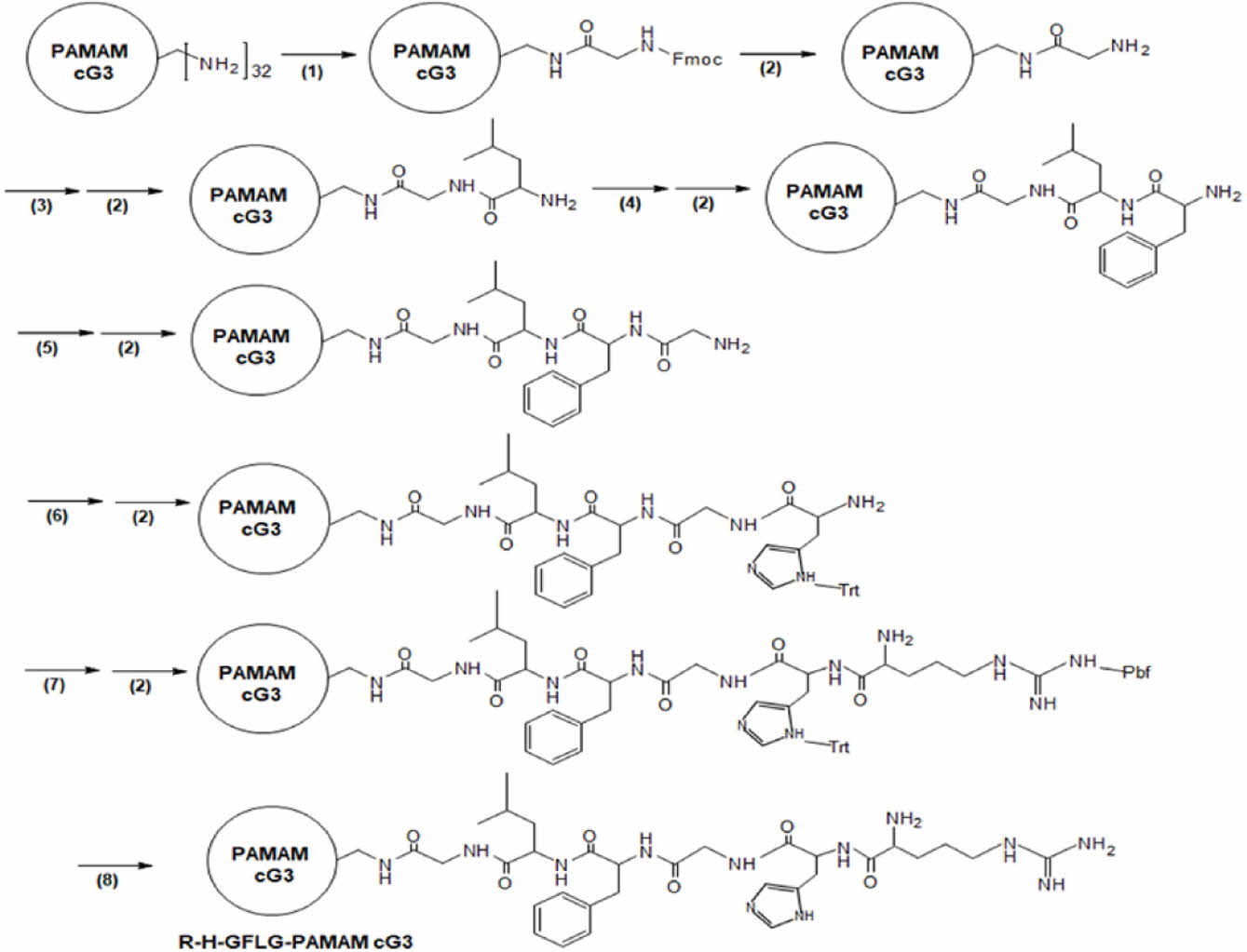 Figure 2 Synthesis scheme of Arg-His-Gly-Phe-Leu-Gly-cystamine core PAMAM G3 (R-H-GFLG-cG3) following Fmoc chemistry: (1) Fmoc-Gly-OH, HoBt, HBTU, DIPEA in DMF/DMSO(1:1); (2) piperidine 30% in DMF/DMSO(1:1); (3) Fmoc-Leu-OH, HoBt, HBTU, DIPEA; (4) Fmoc-Phe-OH, HoBt, HBTU, DIPEA; (5) Fmoc-GlyOH, HoBt, HBTU, DIPEA; (6) Fmoc-His(Trt)-OH, HoBt, HBTU, DIPEA; (7) Fmoc-Arg(pbf)-OH, HoBt, HBTU, DIPEA; (8) TFA solution (TFA : TIS : D.W = 95 : 2.5 : 2.5, v/v/v) for 6 h. |