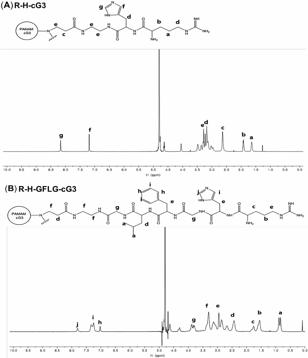 (A) R-H-cG3 피크: δ(in ppm) arginine:1.58(-HCCH2CH2-CH2NH-), 1.84(-HCCH2CH2CH2NH-), PAMAM cG3: 2.50(-NHCH2CH2CO-), 3.19(-NHCH2CH2CO-), 3.24(-NHCH2CH2NH-), histidine: 7.06(-CH(CH2(CCHNCHNH))NH-), 7.88(-CH(CH2 (CCHNCHNH)). (B) R-H-GFLG-cG3피크: δ(in ppm) leucine: 0.83(-CH(CH3)2CHCH2CH-), arginine: 1.55(-HCCH2CH2CH2NH-), 1.76(-HCCH2CH2CH2NH-), 4.29(-HCCH2CH2CH2NH), PAMAM cG3: 2.43(-NHCH2CH2CO-), 2.95(-NHCH2CH2CO-), 3.30(-NHCH2CH2NH-), phenylalanine: 7.02, 7.25(-COCHCH2 (C6H5) NH-), histidine: 7.33(-CH(CH2(CCHNCHNH))NH-), 7.80(-CH(CH2(CCHNCHNH)). 이러한 결과를 통하여 R-H-cG3 PAMAM, R-H-GFLG-cG3 PAMAM의 구조를 확인하였고 합성이 성공적으로 진행되었음을 확인하였다.20
