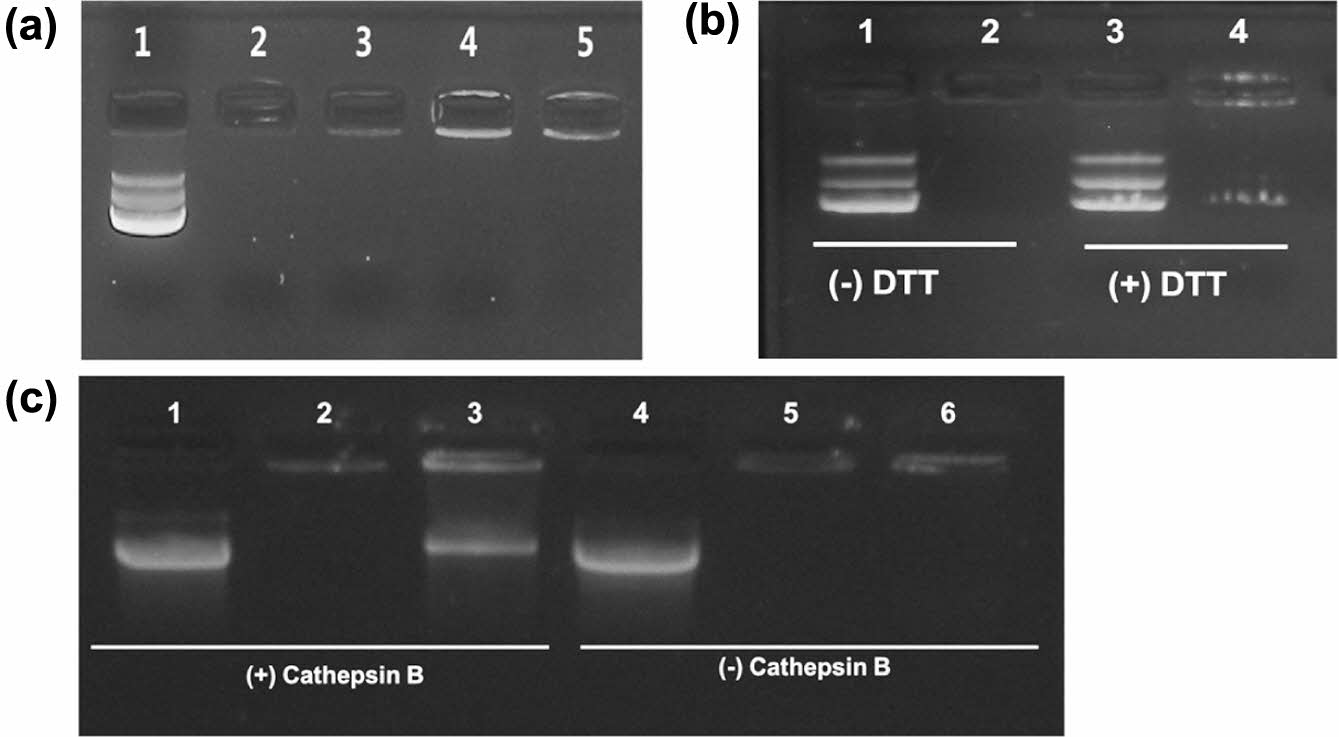 Figure 4 Characterization of R-H-GFLG-cG3 polyplexes using Gel electrophoresis. (a) Formation of polyplexes, lane 1: naked pDNA (pCN-luc, 0.25 ug), lane 2, 3, 4, 5: pDNA:R-H-GFLG-cG3 (1:5, 1:10, 1:15, 1:20 weight ratio, respectively); (b) Dithiothreitol (DTT) test, lane 1: naked pDNA, lane 2: R-H-GFLG-cG3 polyplexes (1:20), lane 3: pDNA + DTT, lane 4: R-H-GFLG-cG3 polyplexes (1:20) + DTT; (c) cathepsin B test, lane 1: pDNA + cathepsin B, lane 2: RH-cG3 + cathepsin B, lane 3: R-H-GFLG-cG3 polyplexes (1:20) + cathepsin B, lane 4: naked pDNA, lane 5: R-H-cG3 polyplexes (1:20), lane 6: R-H-GFLG-cG3 polyplexes (1:20). |