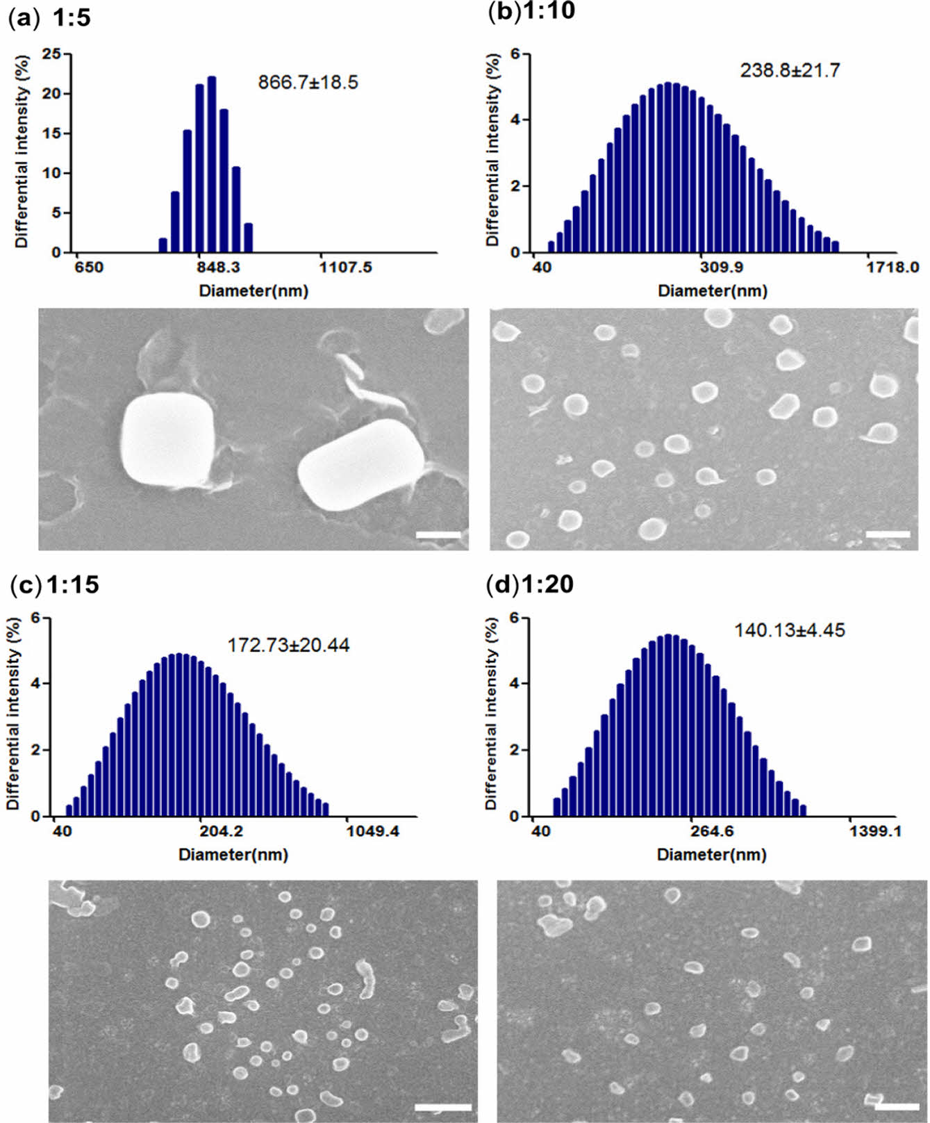 Figure 5 Diameter and morphology of pDNA/R-H-GFLG-cG3 polyplexes using Dynamic Light Scattering (DLS) and Field Emission Scanning Electron Microscope (FE-SEM). DLS results and FE-SEM images of the polyplexes at (a) 1:5; (b) 1:10; (c) 1:15; (d) 1:20 (pDNA: polymer, weight ratio). scale bar = 400 nm. |