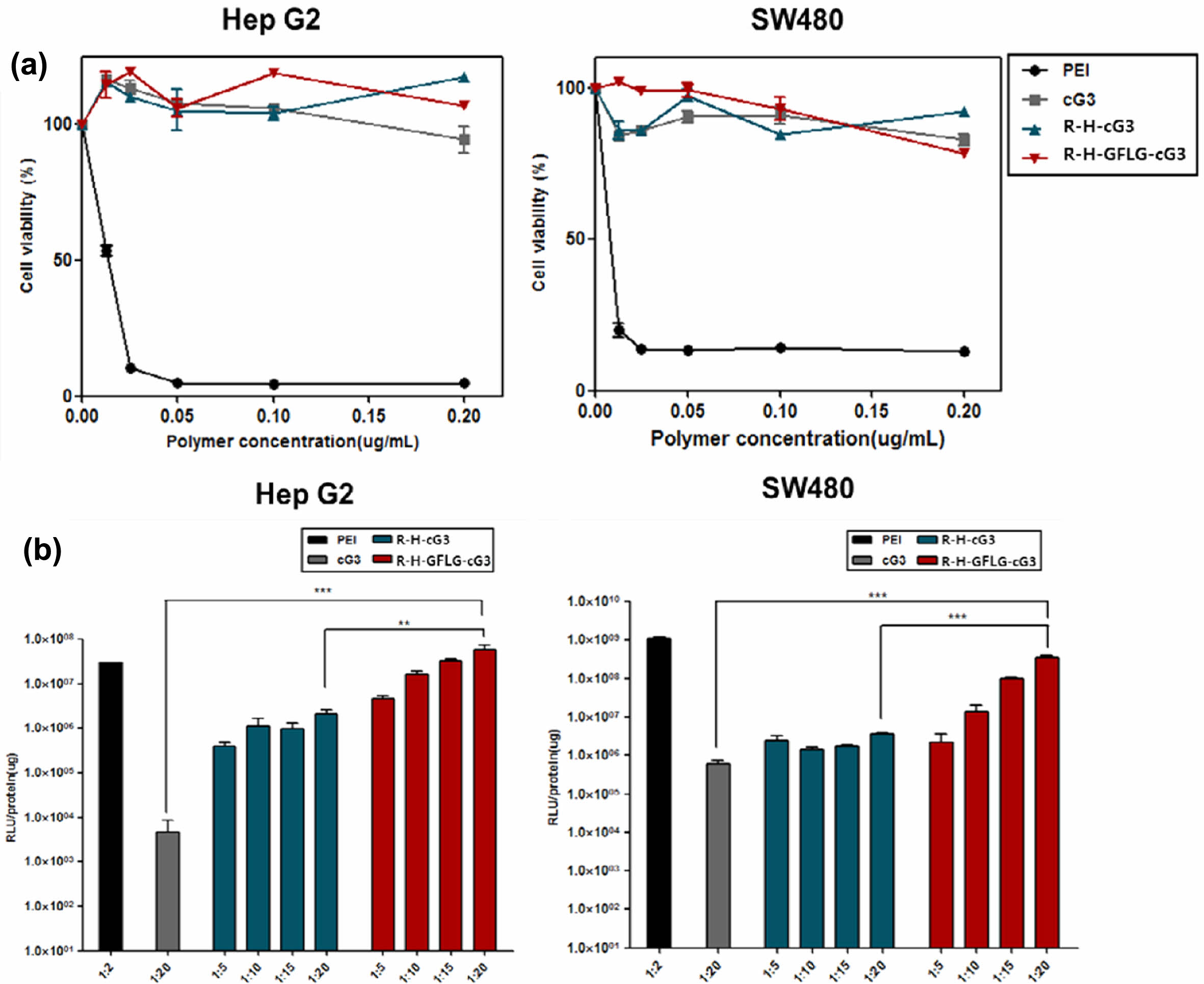 루시페라아제 실험과 공초점 현미경 측정 실험. 유전자 발현율 측정을 위해 루시페라아제 실험을 진행하였다. 48 well plate에 3×104 cells/well의 세포를 넣어준 후 배양하였다. 샘플은 1:5, 10, 15, 20(pDNA : polymer) 중량비로 준비하였고, 세포배양액으로 희석하여 각각 처리하였다. 24시간 후, 배양액을 제거하고 DPBS를 이용하여 세척하였다. Lysis 버퍼를 150 mL씩 각각 처리하여 20분간 교반하였다. 이후 샘플을 수득하여 12000 rpm에서 10분간 원심분리하였다. 상층액의 단백질을 수득하여 BCA assay kit를 이용하여 단백질 정량을 진행하고 루시페린(Luciferin)을 처리하여 발광세기를 발광측정기(Lumat LB 9507, Berthold Technology, Bad Wildbad, Germany)를 이용하여 측정하였다.