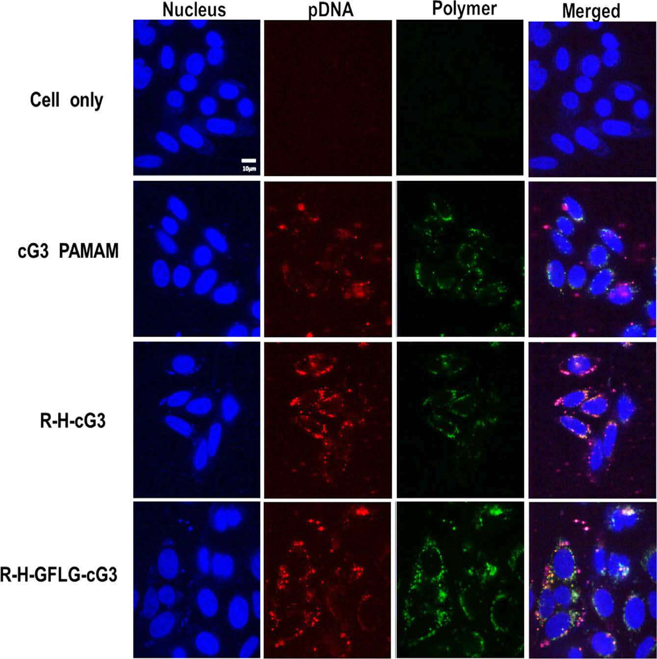 Figure 7 Internalization of R-H-GFLG-cG3 polyplexes in SW480 cells using confocal microscopy. cG3, R-H-cG3 and R-H-GFLG-cG3 were prepared with pDNA at a 1:20 (pDNA:polymer) weight ratio. |