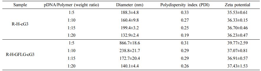 동적광산란법(Dynamic Light Scattering, DLS)과 제타전위(Zeta Potential Values) 측정. pDNA/R-H-GFLG-cG3 복합체의 크기와 표면전하를 측정하기 위해 DLS와 제타전위를 진행하였다. 복합체는 pDNA(5 mg):polymer(1:5, 1:10, 1:15, 1:20)의 중량비로 준비하여 30분간 복합체 형성을 진행하였다. 각각의 샘플은 1:400(v/v)의 비율로 증류수를 이용하여 희석하였고 각각 DLS(ELS-Z, Otsuka Electronics, Osaka, Japan), zeta instrument(Malvern, London, UK)를 이용하여 측정하였다.