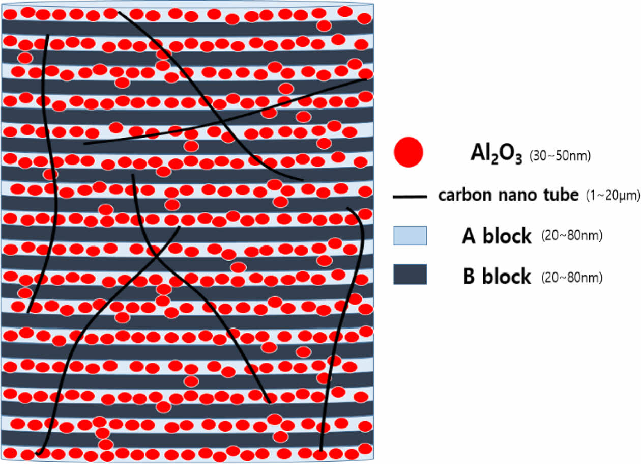 PS-PMMA diblock copolymer/m-Al2O3+CNT composite을 제작하기 위해 PS-PMMA diblock copolymer를 anisole에 용해시킨 용액에 m-Al2O3를 10-60 wt% 그리고 탄소 나노 튜브를 0.9-1.2 wt% 첨가하여 8시간 동안 교반하고 ultrasonicator를 이용해 10분 동안 분산시켰다. 이후 90 ℃ 오븐에서 24시간 건조하여 PS-PMMA diblock copolymer/m-Al2O3+CNT composite를 제조하였다.
