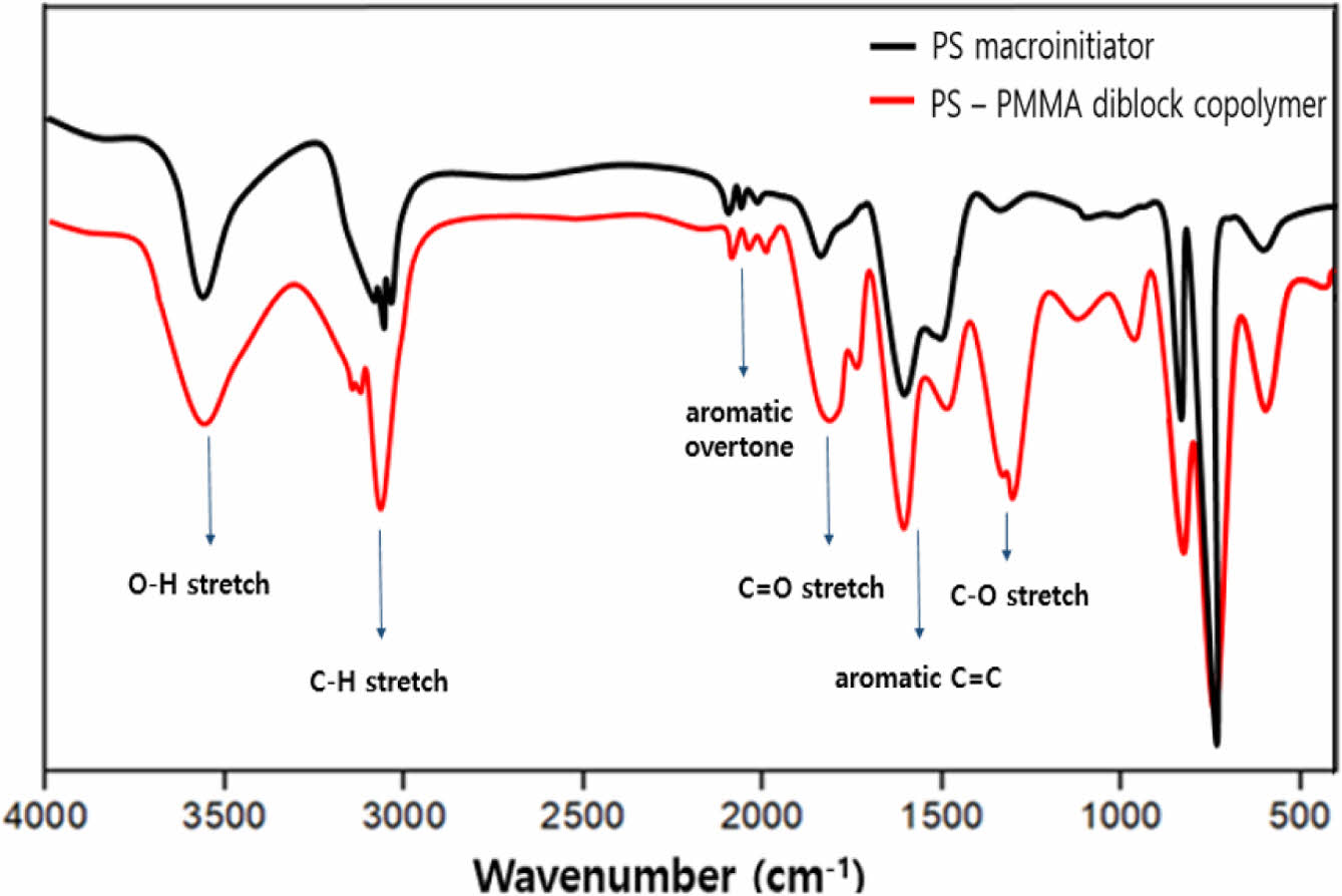 PS-PMMA Diblock Copolymer의 합성. PS macroinitiator 및 PS-PMMA diblock copolymer의 합성을 확인하기 위해 FTIR을 측정하였고, Figure 3에 그 결과를 나타내었다. 먼저 PS macroinitiator는 3500 cm-1 부근에서 CTA의 O-H stretch peak, 3000 cm-1 부근의 C-H stretch peak, 2200-2000 cm-1 부근의 aromatic overtone peak 그리고 1550 cm-1 부근의 aromatic C=C stretch peak로부터 PS macroinitiator가 성공적으로 합성되었음을 확인하였다.7 또한 PS-PMMA diblock copolymer는 1750 cm-1 부근에서의 C=O stretch peak와 1300 cm-1 부근에서의 C-O stretch peak를 통해 합성이 성공적으로 이루어졌음을 확인하였다.8