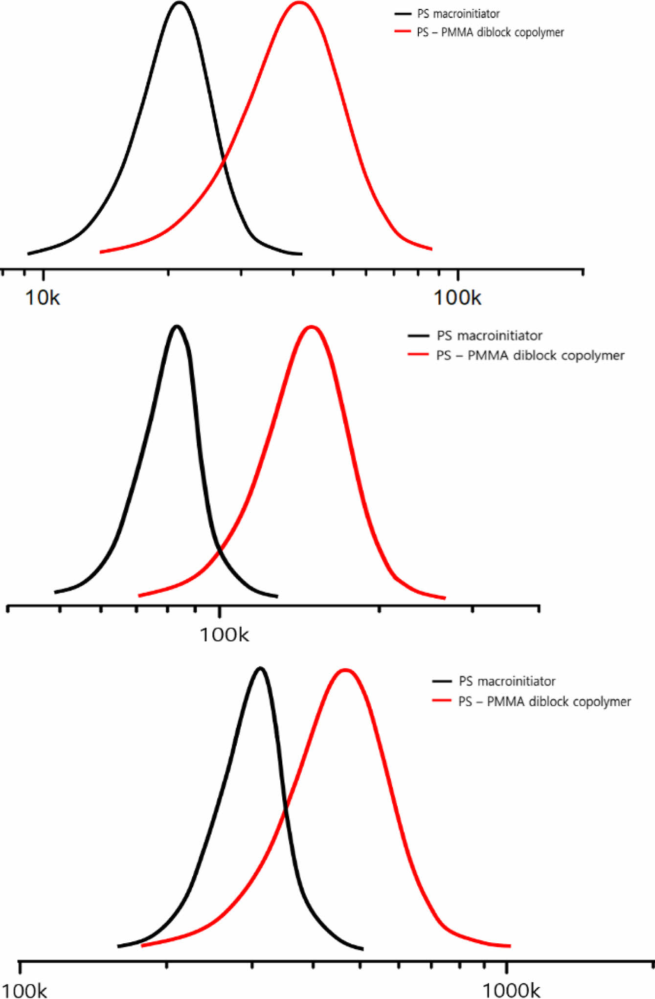 Diblock의 domain size에 따른 선택적 분산을 알아보기 위해 3가지 분자량의 PS-PMMA diblock copolymer를 합성하였으며, 이를 확인하기 위해 GPC를 측정하여 Figure 4에 그 결과를 나타냈다. PS macroinitiator는 각각 20000, 80000 그리고 220000 g/mol의 평균 분자량을 가지며, 각각의 PS macroinitiator에 MMA를 첨가하여 40000, 160000 그리고 420000 g/mol의 평균 분자랑을 가지는 PS-PMMA diblock copolymer를 합성하였다.