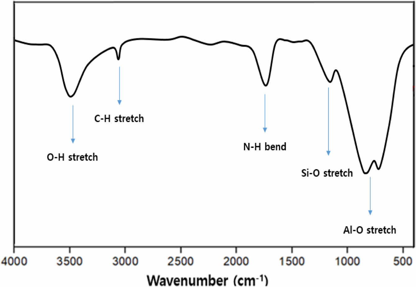 Al2O3 표면 개질. Al2O3의 표면 개질을 확인하기 위해 m-Al2O3의 FTIR을 측정하였으며, 그 결과를 Figure 5에 나타냈다. 400-1000 cm-1 부근의 넓은 영역에서 Al-O의 stretch peak가 나타났고, 1150 cm-1 및 1650 cm-1 부근에서 각각 Si-O stretch peak와 N-H band peak가 나타났다. 또 3000 cm-1 부근에서 C-H stretch peak를 확인하였으며, 3500 cm-1 부근의 넓은 영역에서 O-H stretch peak와 N-H stretch peak가 나타나 Al2O3의 표면 개질이 성공적으로 진행되었음을 확인하였다.6