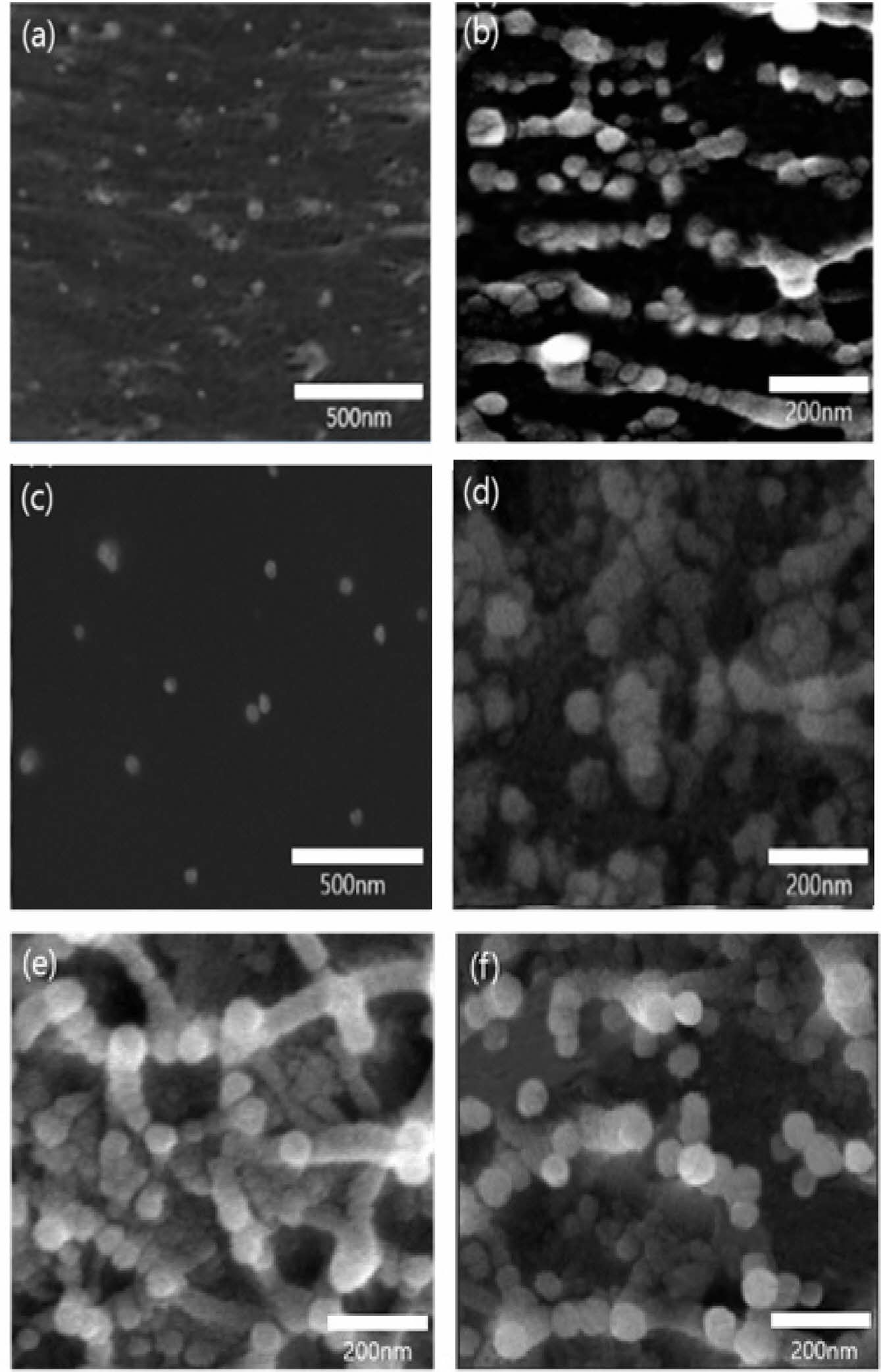 Figure 6 SEM images of heat radiating composites: (a) 160000 g/mol, PS-PMMA diblock copolymer/10 wt% m-Al2O3; (b) 160000 g/mol, PS-PMMA diblock copolymer/40 wt% m-Al2O3; (c) PS-PMMA random copolymer/10 wt% m-Al2O3; (d) PS-PMMA random copolymer/ 40 wt% m-Al2O3; (e) 40000 g/mol, PS-PMMA diblock copolymer/ 40 wt% m-Al2O3; (f) 420000 g/molPS-PMMA diblock copolymer/ 40 wt% m-Al2O3. |
