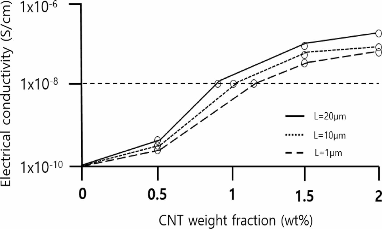 CNT 도입에 따른 방열 복합소재의 전기 전도도. 전기절연성을 유지할 수 있는 방열 복합소재에 도입 가능한 최적의 CNT 길이와 함량을 결정하기 위해 분자량이 160000 g/mol인 PS-PMMA diblock copolymer에 m-Al2O3의 함량을 40 wt%로 고정하고, 길이가 1, 10 그리고 20 μm인 CNT의 함량에 따른 방열 복합소재의 전기전도도를 4 point probe를 이용하여 측정하였으며, 그 결과를 Figure 7에 나타냈다. Figure 7에서 알 수 있는 바와 같이 CNT의 길이가 길어질수록 같은 함량에서의 전기전도도는 더 높게 나타났으며, 이는 CNT의 길이가 길어질수록 CNT 자체의 전기전도도가 증가하여 전기를 전달하는 통로를 형성하기 쉽기 때문이다.10,11 따라서 전기절연 기준인 1×10-8 S/cm를 초과하지 않기 위해서는 CNT의 길이가 1, 10 그리고 20 μm인 경우에 각각의 함량을 1.2, 1.0 그리고 0.9 wt% 수준에서 사용해야 전기 절연성 방열 복합소재를 제작할 수 있음을 확인하였다.