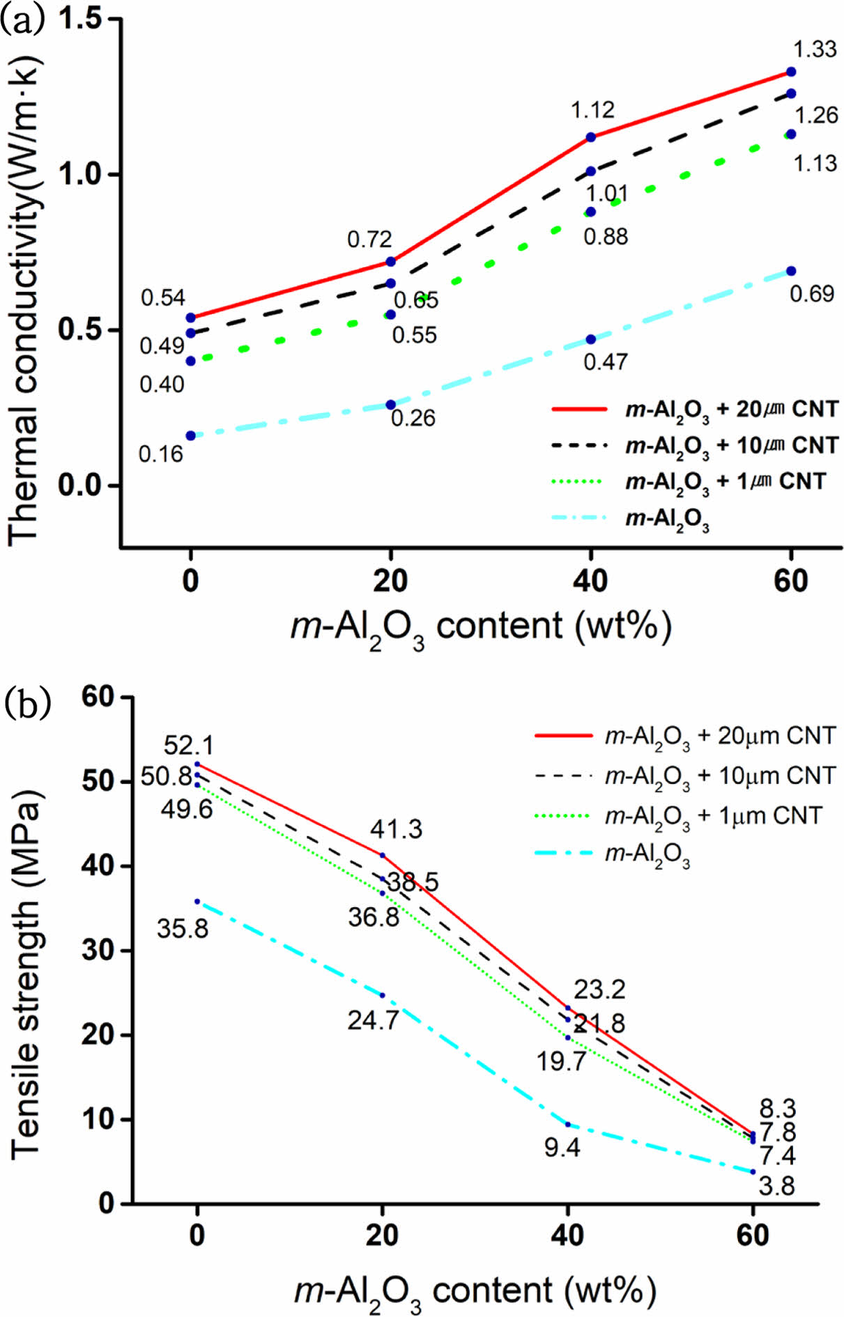 Figure 9 a) Thermal conductivity; (b) tensile strength of composite according to selective dispersion of m-Al2O3. |