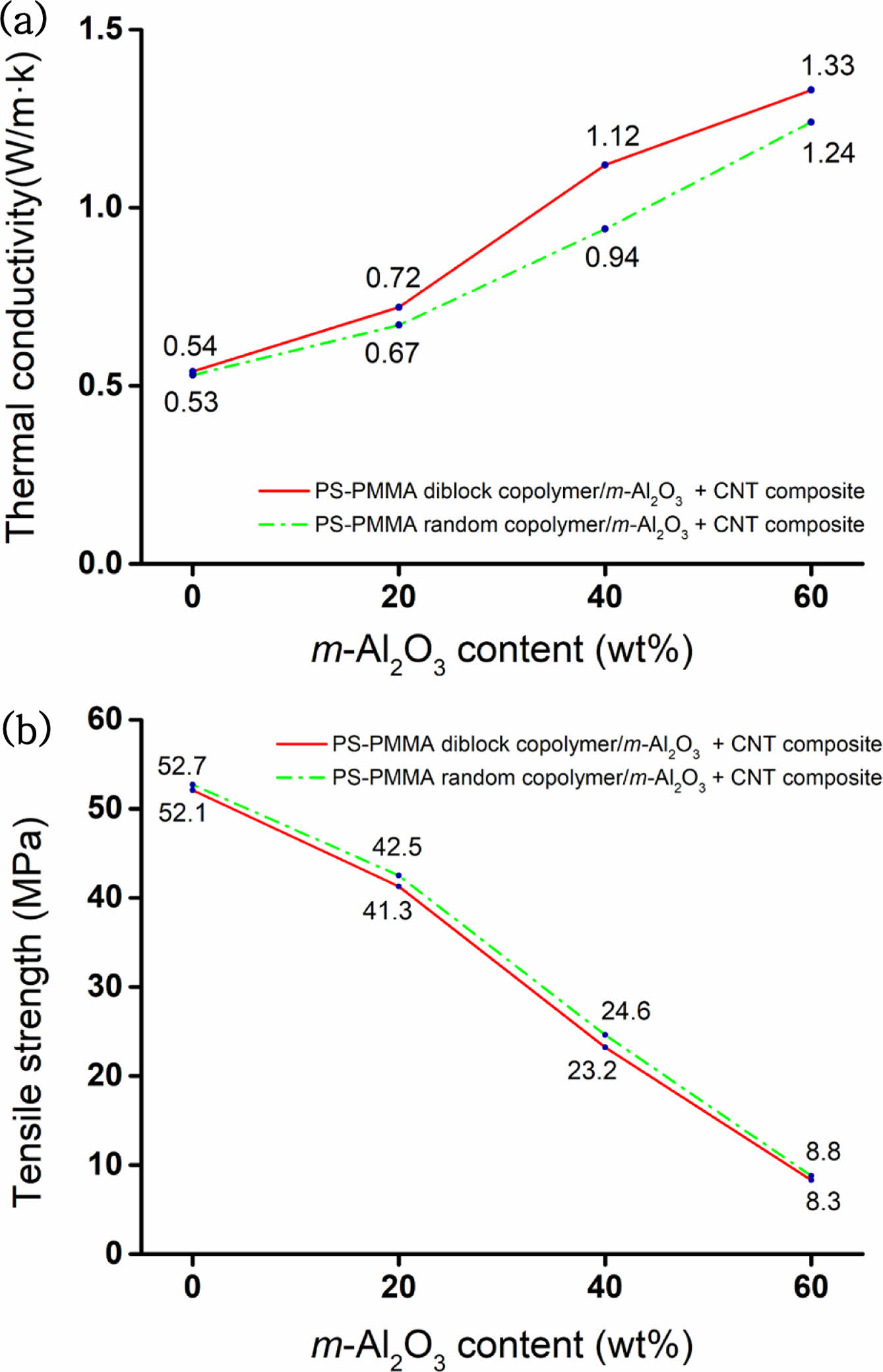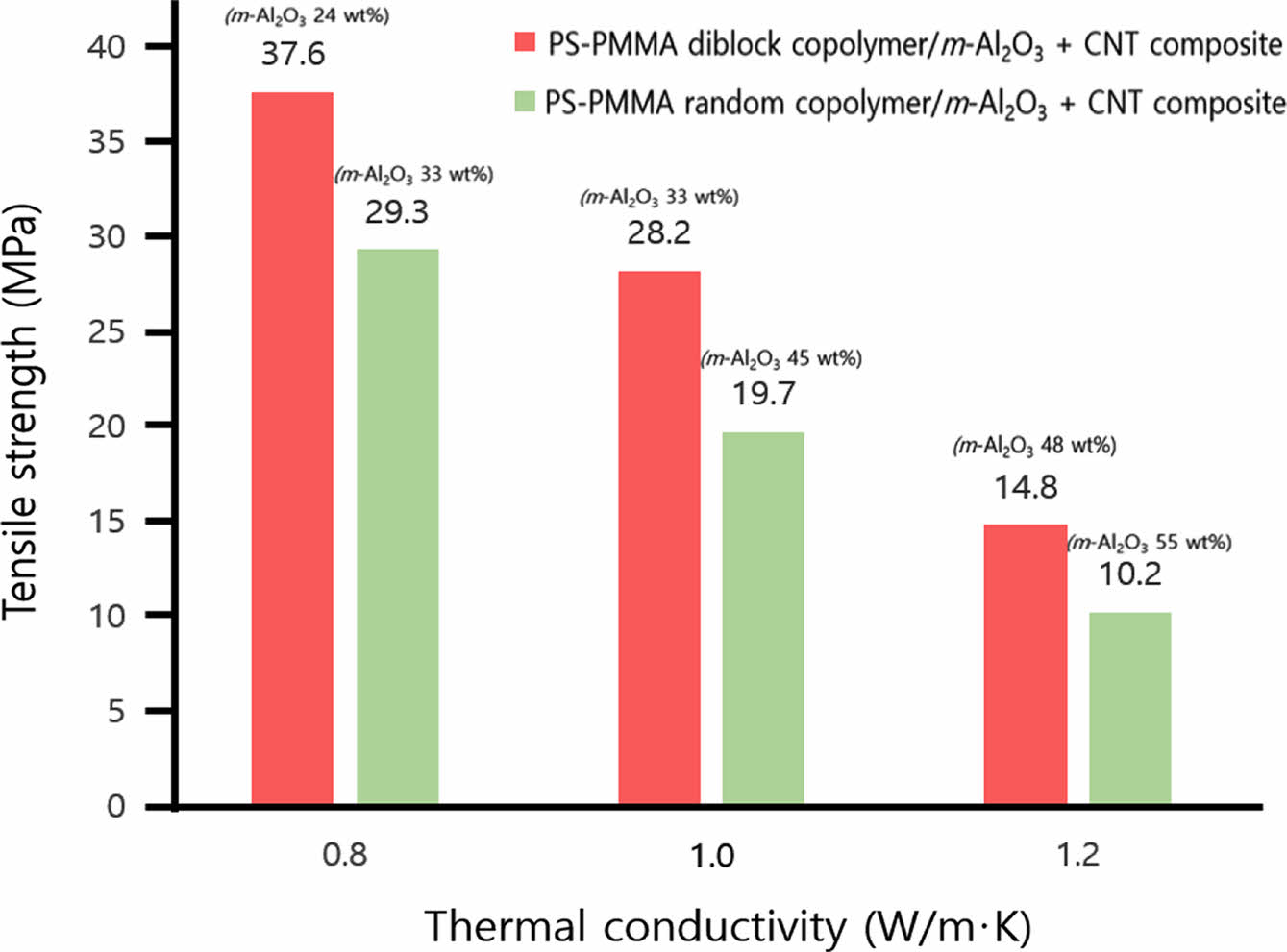 Figure 10 Relationship between tensile strength and thermal conductivity of PS-PMMA diblock copolymer/m-Al2O3+CNT composite and PS-PMMA random copolymer/m-Al2O3+CNT composite |