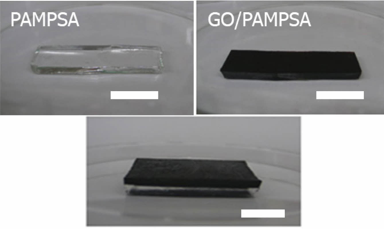 Figure 2 Synthesized PAMPSA hydrogel, GO/PAMPSA hydrogel and bi-layer hydrogel. Scale bars indicate 1 cm. |